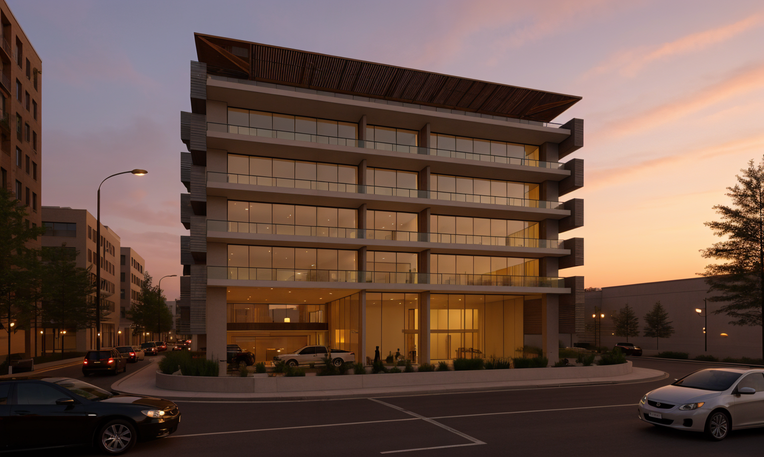 create a full furnished office with a glass front two doors in the middle it should have a meeting table a kitchen and a chill area by the window make it look modern and realistic