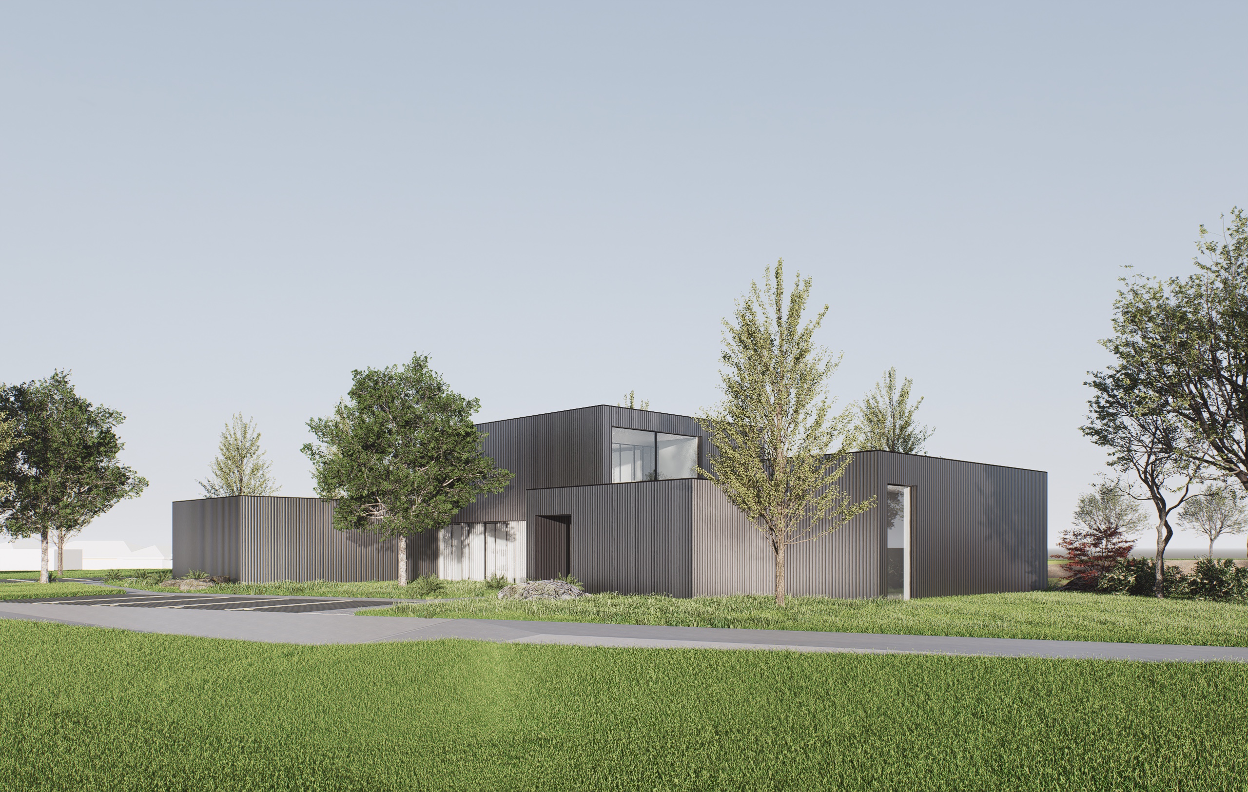 enhance the realism of this architectural visualization while strictly preserving the original geometry volumes proportions and composition dont change any shapes layout camera angle or perspective improve material realism with physically accurate textures pbr and make the gray colour of the facade brighter add realistic lighting with natural global illumination soft shadows ambient occlusion and accurate reflections refractions slight atmospheric depth and realistic color grading maintain the original framing and scene structure exactly as is focus on photorealism high dynamic range and cinematic quality without modifying the design