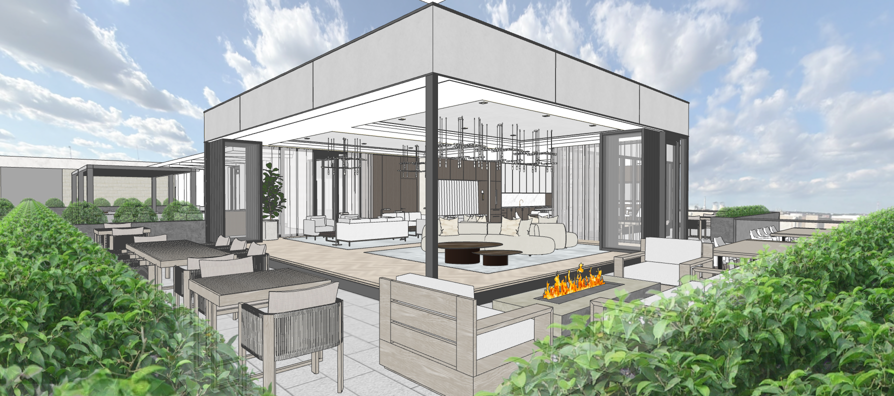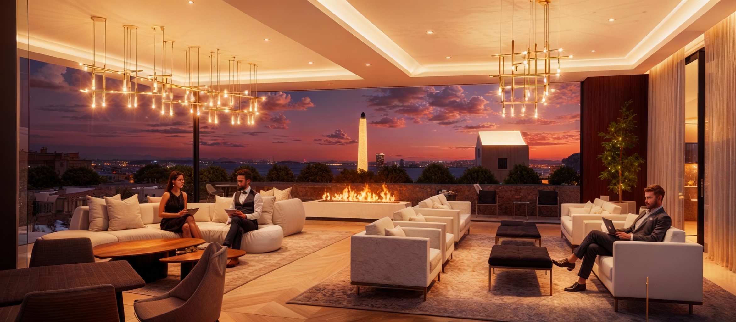 luxurious penthouse with interior lighting and upscale people lounging