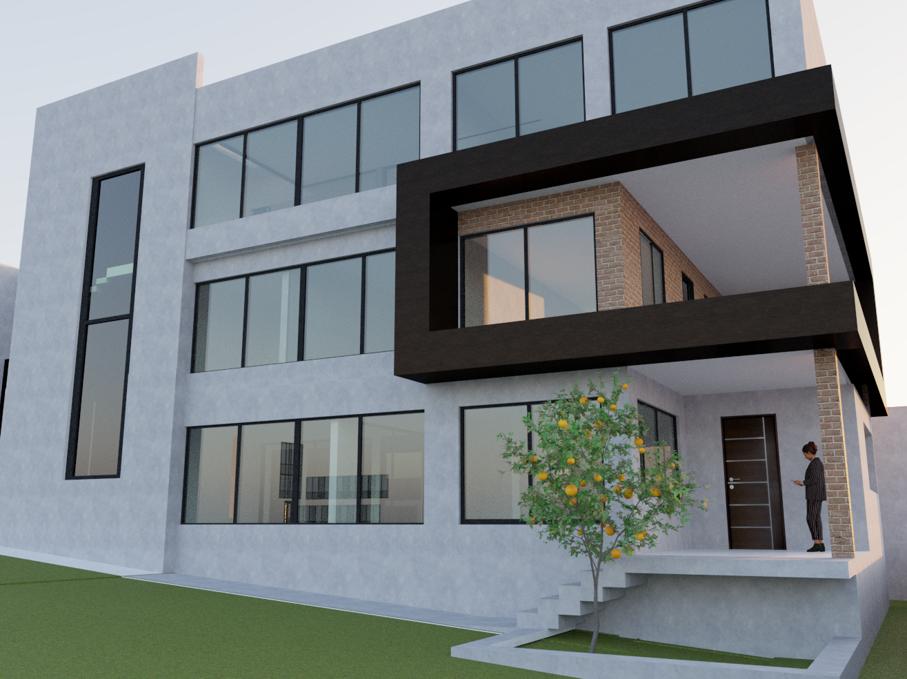 use the reference image as base composition modern laboratory and office building three story contemporary architecture with minimalist design and clean geometry facade materials smooth polished concrete facade in light gray tone large architectural frame made of polished concrete painted matte black wrapping the second floor terrace exposed red brick walls inside the recessed volume large black aluminum framed windows with floor to ceiling glazing and continuous horizontal window bands the building has large modern windows for laboratory and office spaces creating a clean and professional contemporary research facility aesthetic at the entrance there is a small concrete staircase leading to a polished concrete platform with a geometric concrete planter containing an orange tree making the tree an important landscape element that softens the architecture landscape minimal lawn clean modern planter integrated into the architecture orange tree with visible fruits as focal point near the entrance lighting and atmosphere golden hour sunset lighting warm natural sunlight hitting the concrete and brick textures soft long shadows subtle warm interior lighting visible through the windows but not excessive led exterior lighting calm professional atmosphere rendering style photorealistic architectural visualization high quality materials v ray style realism soft global illumination balanced exposure architectural style modern mexican contemporary architecture minimalist laboratory and office building refined material contrast between polished concrete black frame glass and brick camera three quarter frontal perspective showing the entrance tree planter large windows and architectural frame ultra realistic textures subtle imperfections in concrete natural reflections on glass cinematic architectural photography