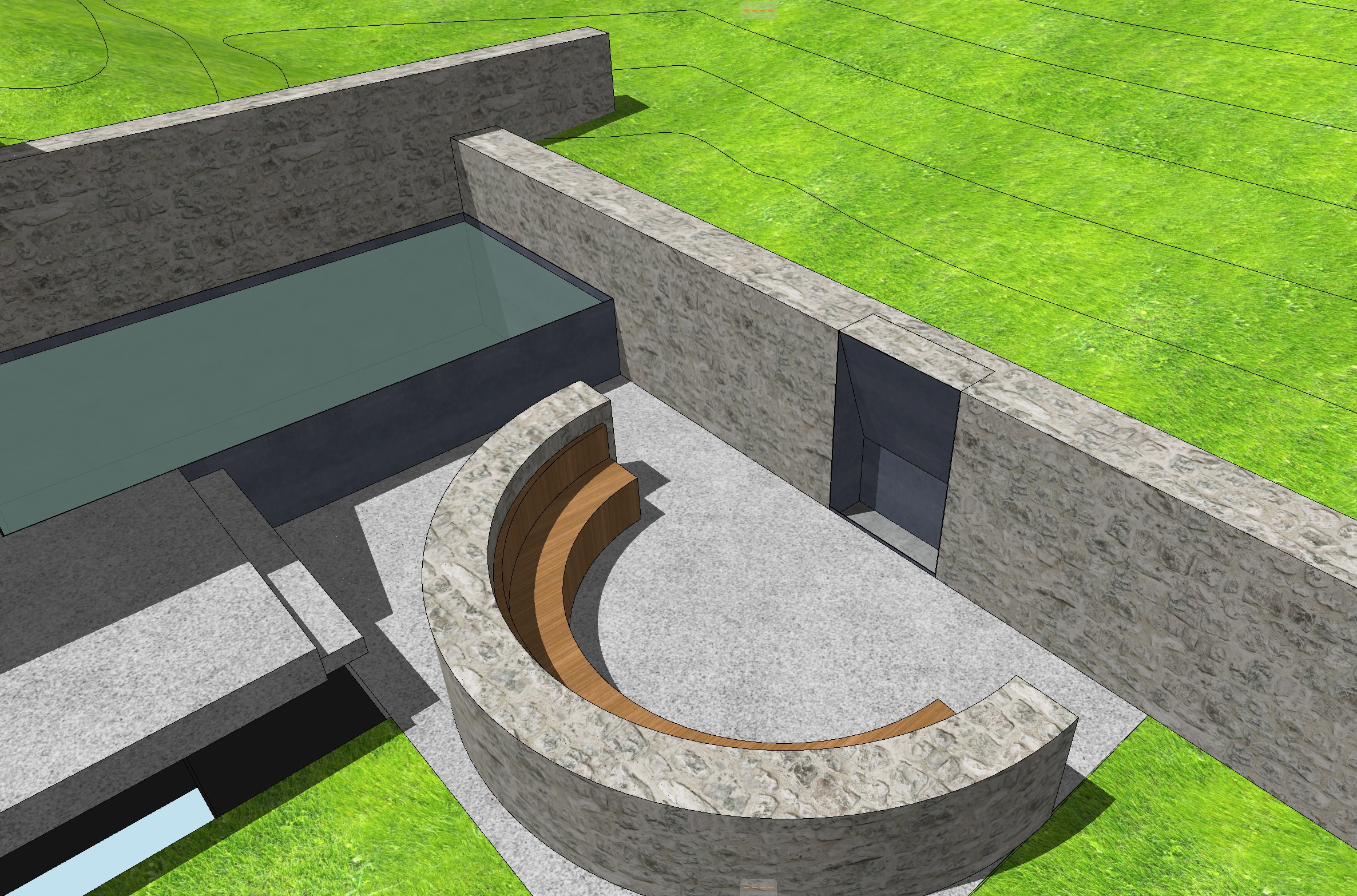 evening light grasses brown drystack stone walls fire in fireplce people in pool people sitting in the curved bench bench material to be outdoor furniture cushions