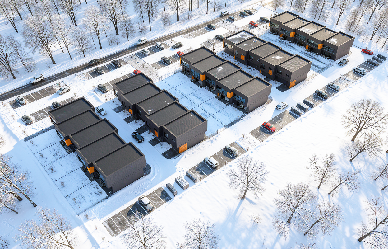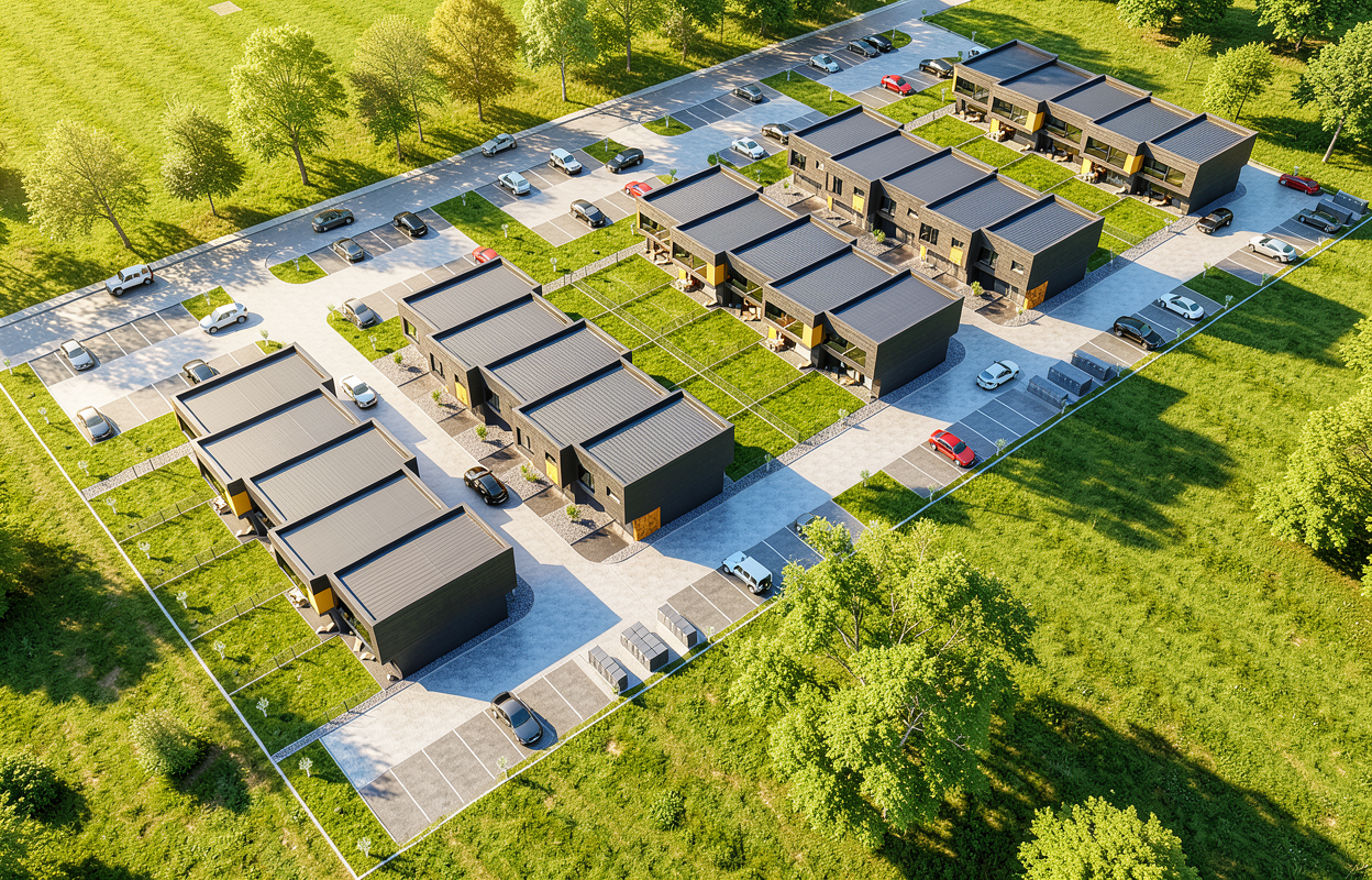do not change buildings do not change graphic signs summer do not change the colors of the buildings do not add any text or change the building facades take a photorealistic bird s eye view shot summer