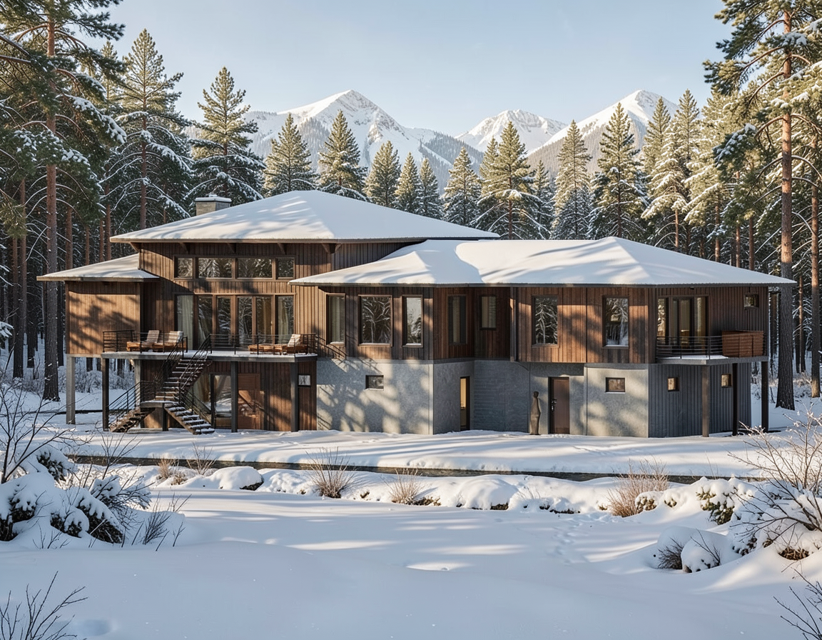 winter time almost evening harp lights black frames trees more realistic at the background show different height of trees inside the buildings show furniture the windows are darker the lights in landscape should be realistic and metal material