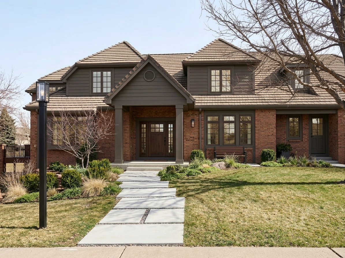 zaha hadid exterior shot change the trim to urban bronze and the windows make the siding white keep the brick and the roof the same architecture