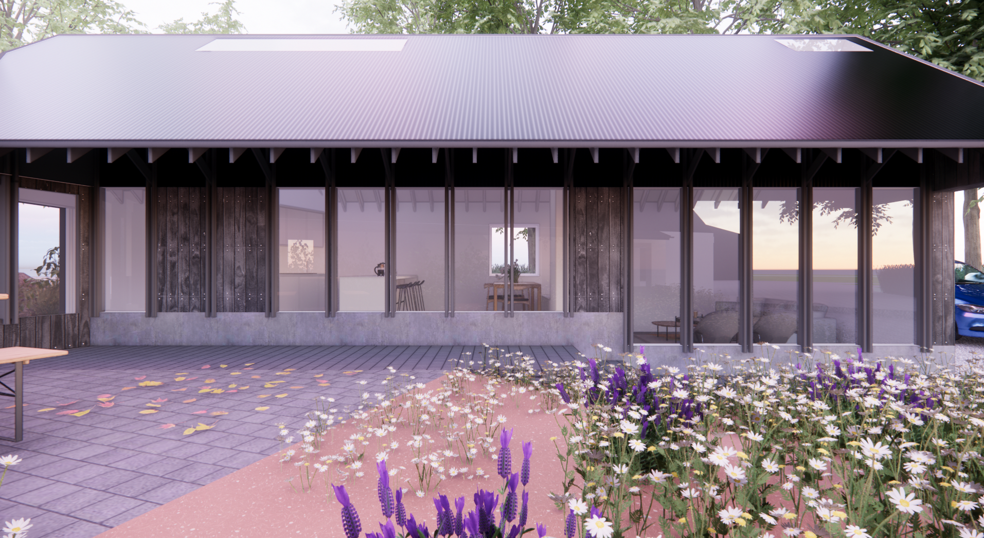 black corrugated roof interior shows a kitchen dining space in the centre and a sitting room space on the right