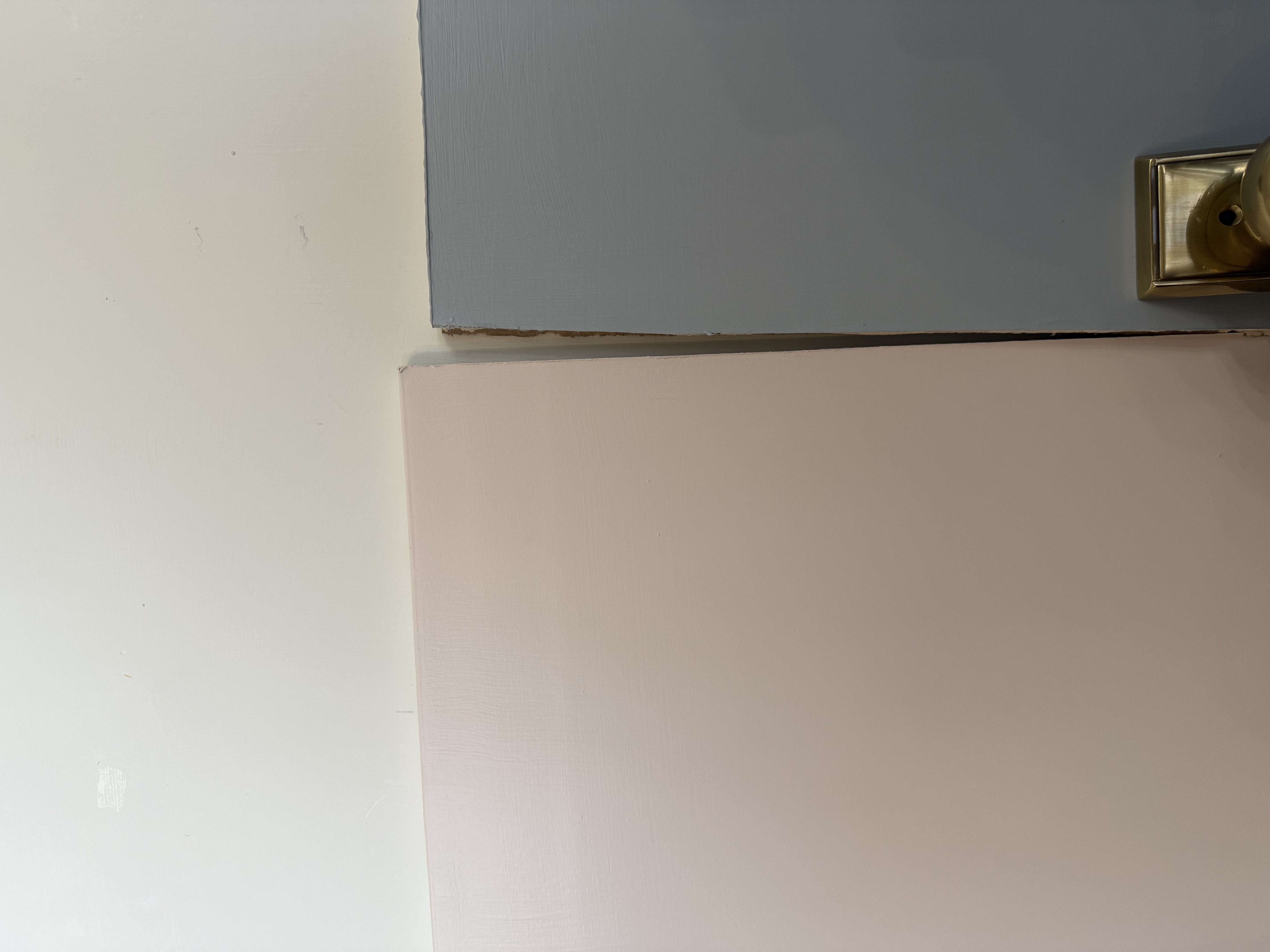 show me a teen girls bedroom with the color palette pale pink walls white ceiling white trim light blue gray doors pale pink trim around doors