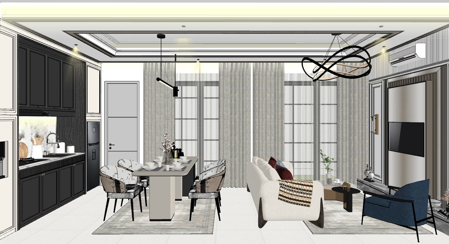 a beautifully rendered contemporary living room and kitchen space featuring a sophisticated monochromatic palette with warm undertones the kitchen cabinetry is sleek and black complemented by a polished marble backsplash with subtle gray veining the dining area boasts upholstered chairs in a chic beige and brown pattern around a modern gray dining table the living room presents a plush red burgundy sofa adorned with textured pillows in rich burgundy and deep navy the room s atmosphere is bright and inviting emphasized by natural light filtering through sheer light gray curtains the ceiling showcases an intricate coffered design with ambient lighting and a modern black pendant light the decor is minimalistic yet elegant with thoughtful details such as a golden decorative sculpture on a sleek black coffee table and a single potted plant adding a touch of greenery