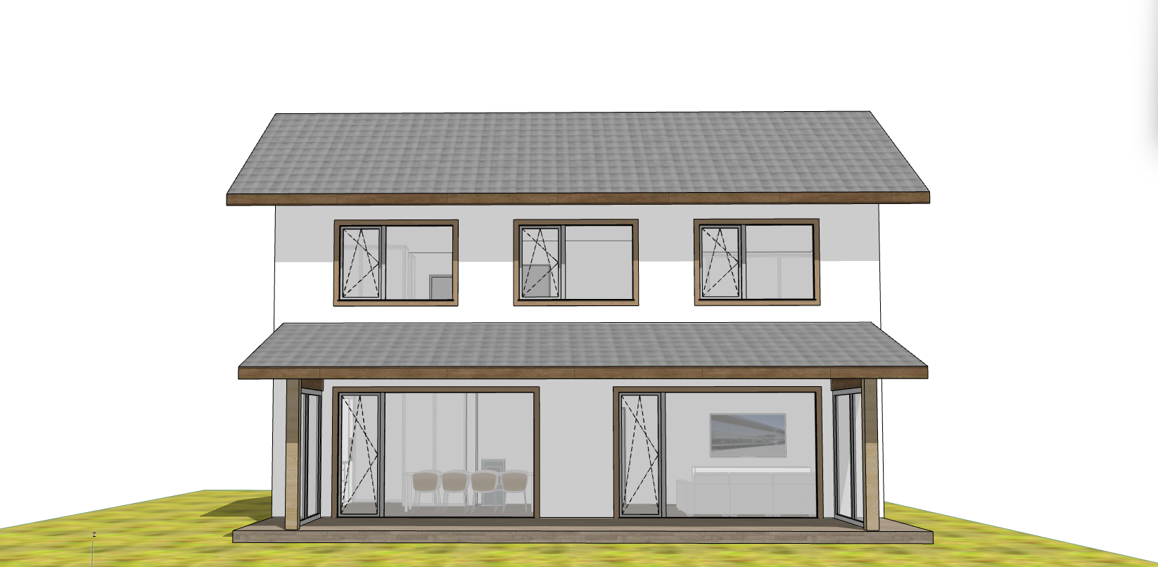 modern exterior shot render a modern two story house with clean minimalist lines the walls are crisp white with elegant wooden accents for the window frames and eaves in a rich warm brown the roof is a sleek grey slate large glass windows with a subtle reflection capturing soft daylight the foreground has a lush green lawn with natural looking textures set the atmosphere to a serene early morning with a light mist evoking a calm and peaceful feeling architecture