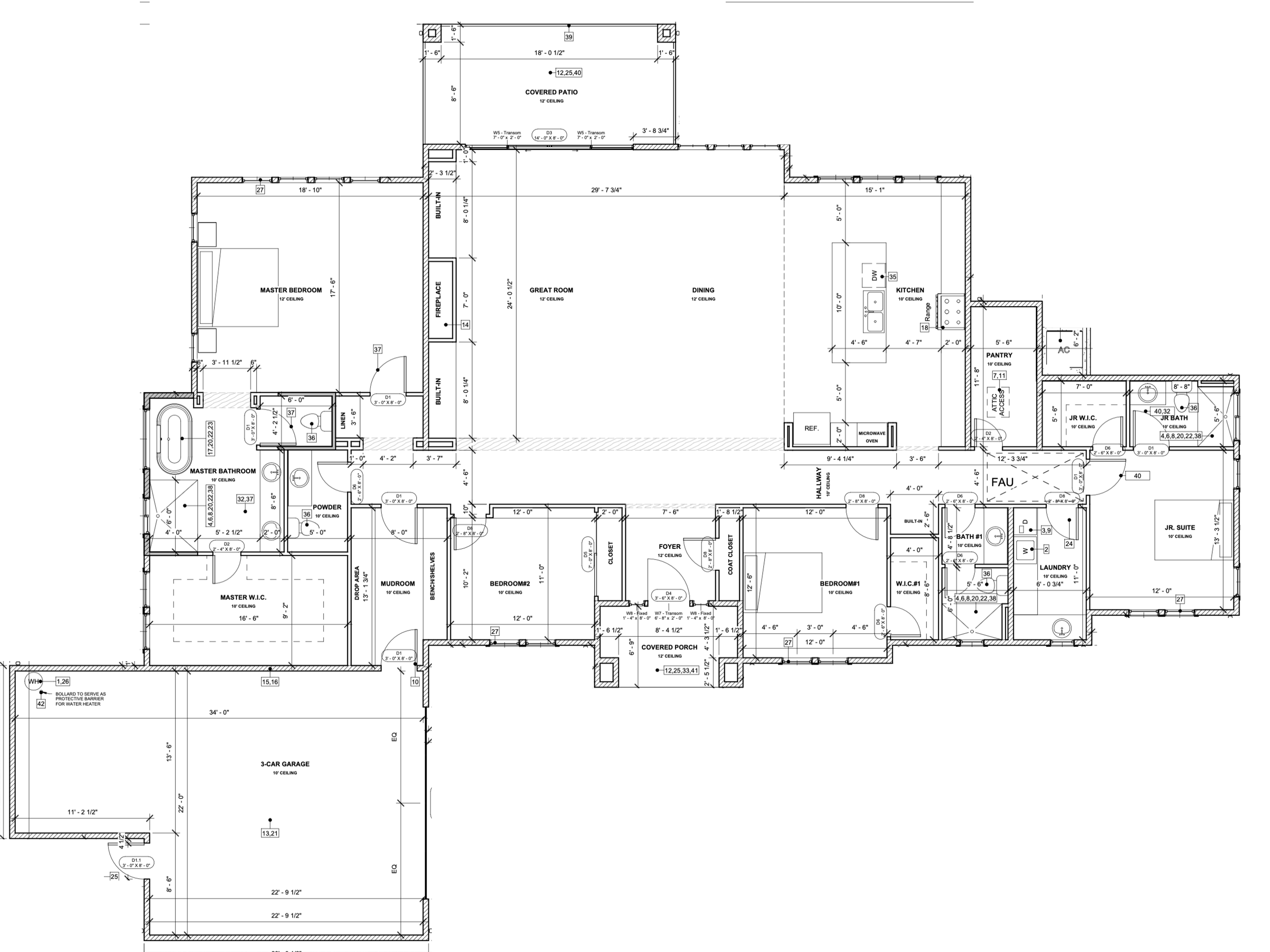 convert this floor plan into a realistic isometric 3d view of a full house show the space from an elevated angle with furniture walls and details visible make it in contemporary style with light furniture and hardwood flooring everywhere except bathrooms use the same furniture as shows on the plan do not change the orientation of the floorplan
