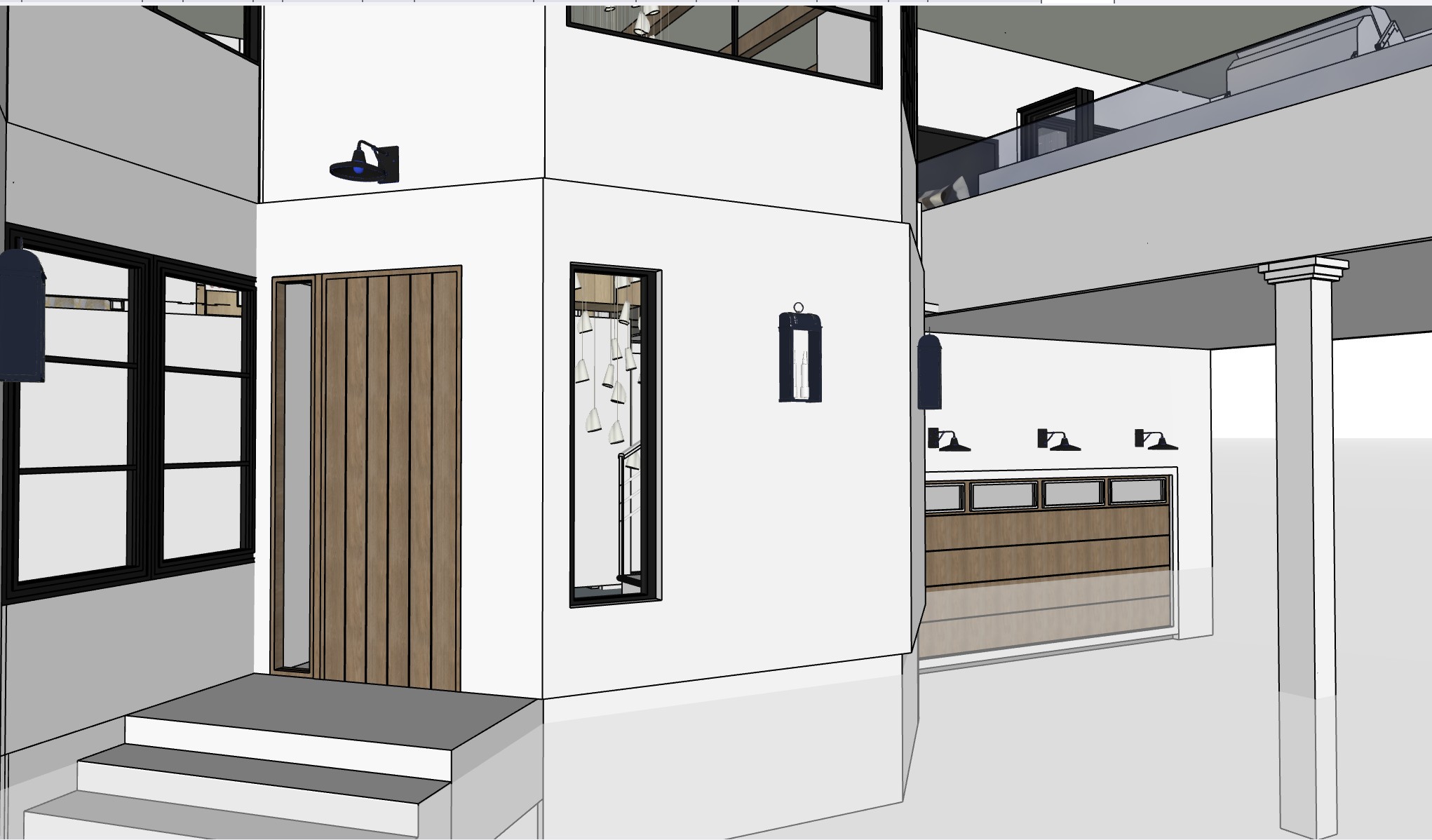 recreate this photorealistic rendering of this exterior with light grey nu cedar shingle siding keep light oak garage door keep lighting and all finishes walls and windows as is except remove horizontal white detail on left section of building