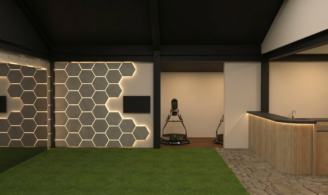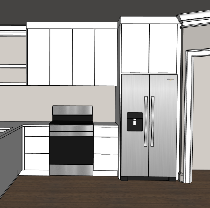 modernist interior shot white box aside from floors and appliances greenery through window architecture