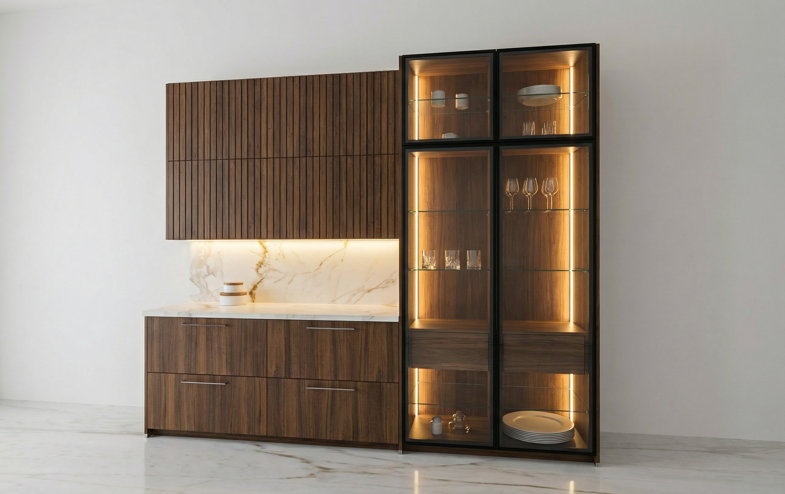 elegant bar dark walnut and with dark glass vertical soft lights inside the glass tall unit nothing reflected on the glass