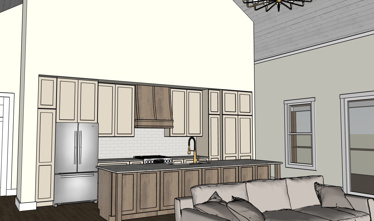 walls are sherwin williams alabaster island and range hood are knotty alder stained wood wall cabinets are sherwin williams accessible beige white subway tile backsplash add decor cabinet pulls are to be brass finish white shiplap on ceiling add can lighting wooded lot outside of window
