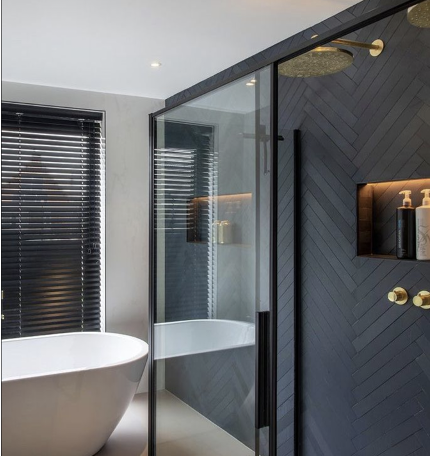 create a serene and luxurious bathroom scene based on the given layout the room dimensions are approximately 6 x 11 design a modern japanese scandinavian bathroom from the pov of the entry on the right is the toilet followed by a minimalist walnut wood floating vanity with a sink sunk into it on either side of the mirror and handblown glass light fixtures in front of the viewer on the back wall is a fully enclosed shower area a dark green tiled spa steam shower the doors to the shower slide and seal to hold in steam on the left opposite the vanity include a dark brown stone freestanding oval bathtub on the left that sits directly on the floor include two small windows on the left above the tub that allow direct sunlight in use a color palette of neutral tones charcoal wood stone for a zen calming effect with matte brass fixtures the atmosphere should be peaceful and spa like inviting relaxation and tranquility no plants add dark walnut herringbone flooring
