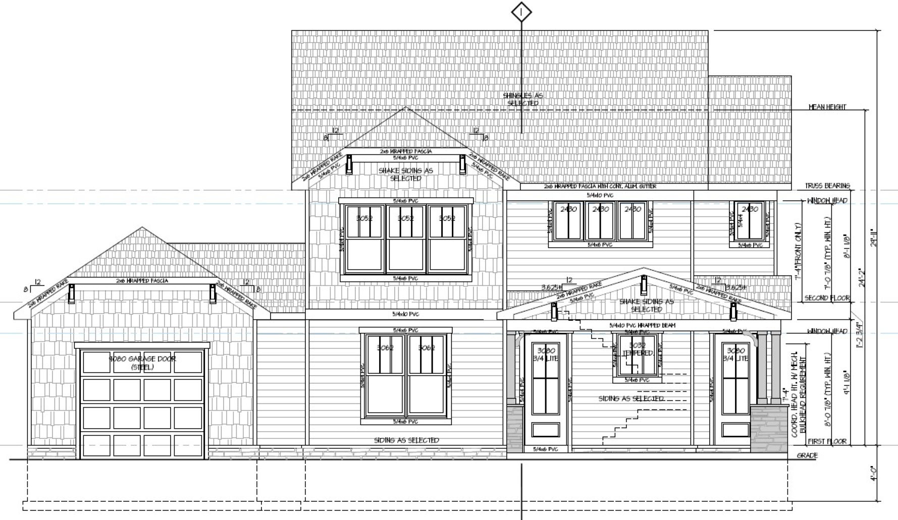 create a lifelike photo based on the architectural blueprint do not change anything structurally siding both shake and clapboard herringbone color garage door ultra grain medium gutters trim windows window surround white