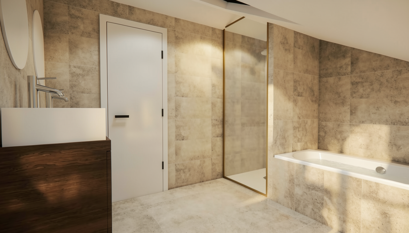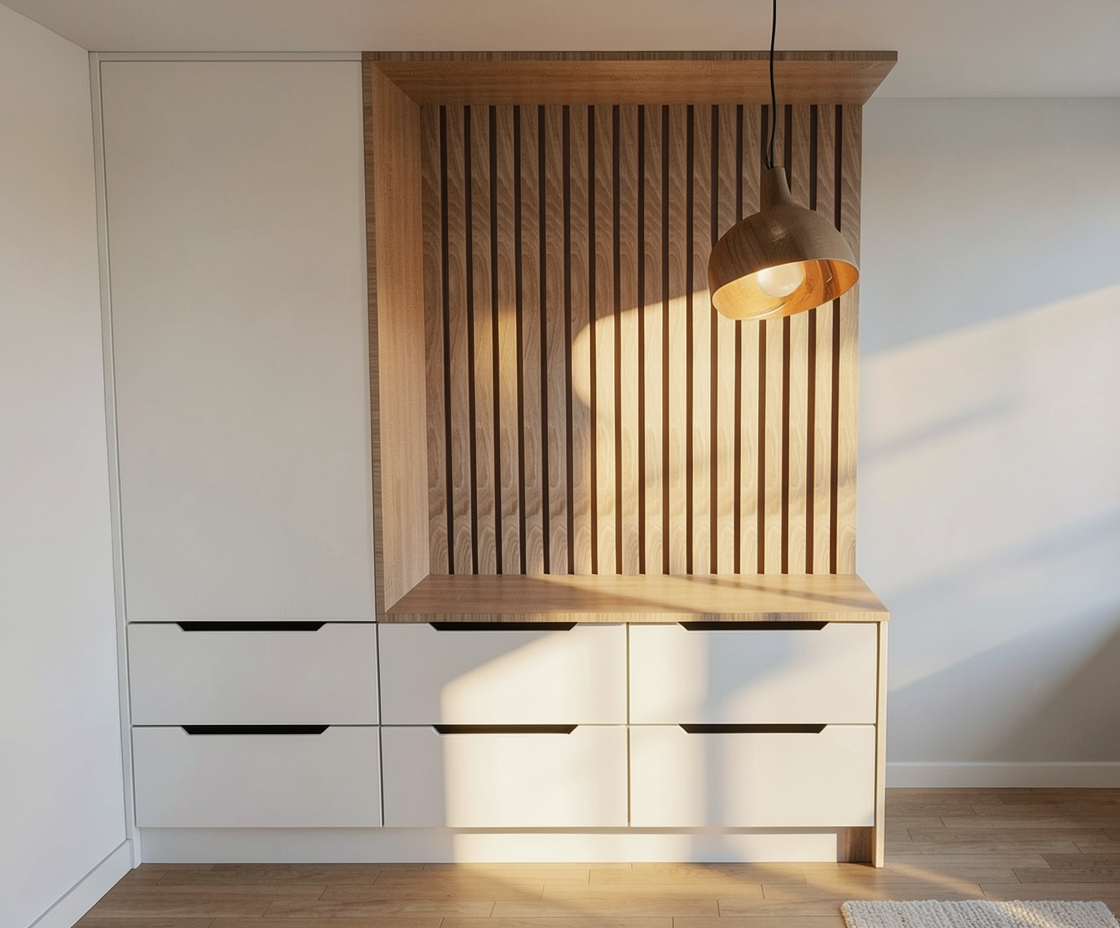 colours to remain accurate as per original given picture wood texture to be subtle drawers and all table top surface in muted light warm earthy light brown wood laminate with subtle light olive undertone matte finish niche in light beige microcement and only bottom till study table in muted light warm earthy light brown wood laminate with subtle light olive undertone matte finish top half of carpentry in solid colour light beige and only bottom till study table in muted light warm earthy light brown wood laminate with subtle light olive undertone matte finish 2 doors full height cabinet in mirror recessed 150mm height skirting ontop ceiling in off white bed headboard in solid colour light beige floor in muted light beige vinyl subtle grains ceiling fan in white walls in off white sunlight coming in from the right side of room socket switch in white edge of wardrobe to be curved