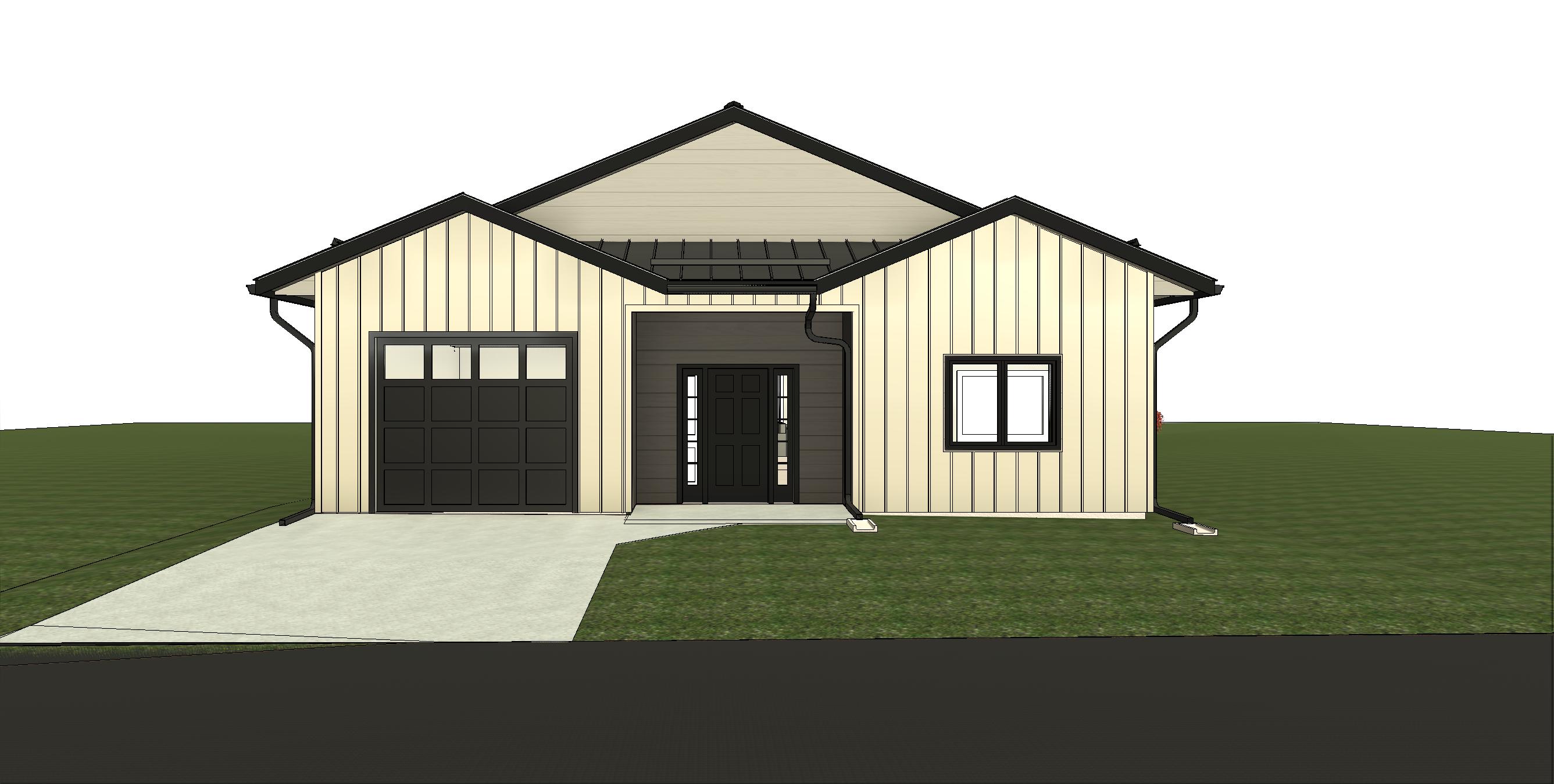 a modern suburban rancher with a combination of lp smartside horizontal lap siding in timberland suede on the upper roof gable as shown lp smartside board and batten in timberland suede as shown and lp smartside horizontal lap siding in bonsai black in the front door entry and side walls as shown black garage door with windows across the top front door is black with glass sidelights as shown black standing seam metal roofing black fascia and black metal soffit retain the exact structure window arrangement rooflines height and proportions exactly as shown in the reference image add a smooth concrete front driveway extending toward the house garage door and a walkway from the driveway to the front door bronze tinted reflective windows enhance materials and colors keep exact window structure arrangement rooflines and proportions exactly as shown in the reference image soft interior lighting inside the home creates warmth the home around the property is a few sparse mixed evergreens and hardwoods add some typical yard landscaping such as shrubs flowers rocks etc place the sun out of view casting soft rays and subtle dappled highlights across the front of the home create ultra realistic lighting crisp shadows detailed textures in the wood and glass reflections and a vibrant clear sky with light atmospheric depth render in hyper realistic architectural visualization quality 8k resolution do not change the view angle