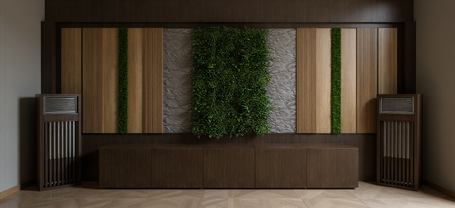 landscape tropical garden with manicured bushes and palm trees atmosphere serene luxurious eco conscious lighting natural daylight soft shadows color palette neutral tones white beige wood brown soft green