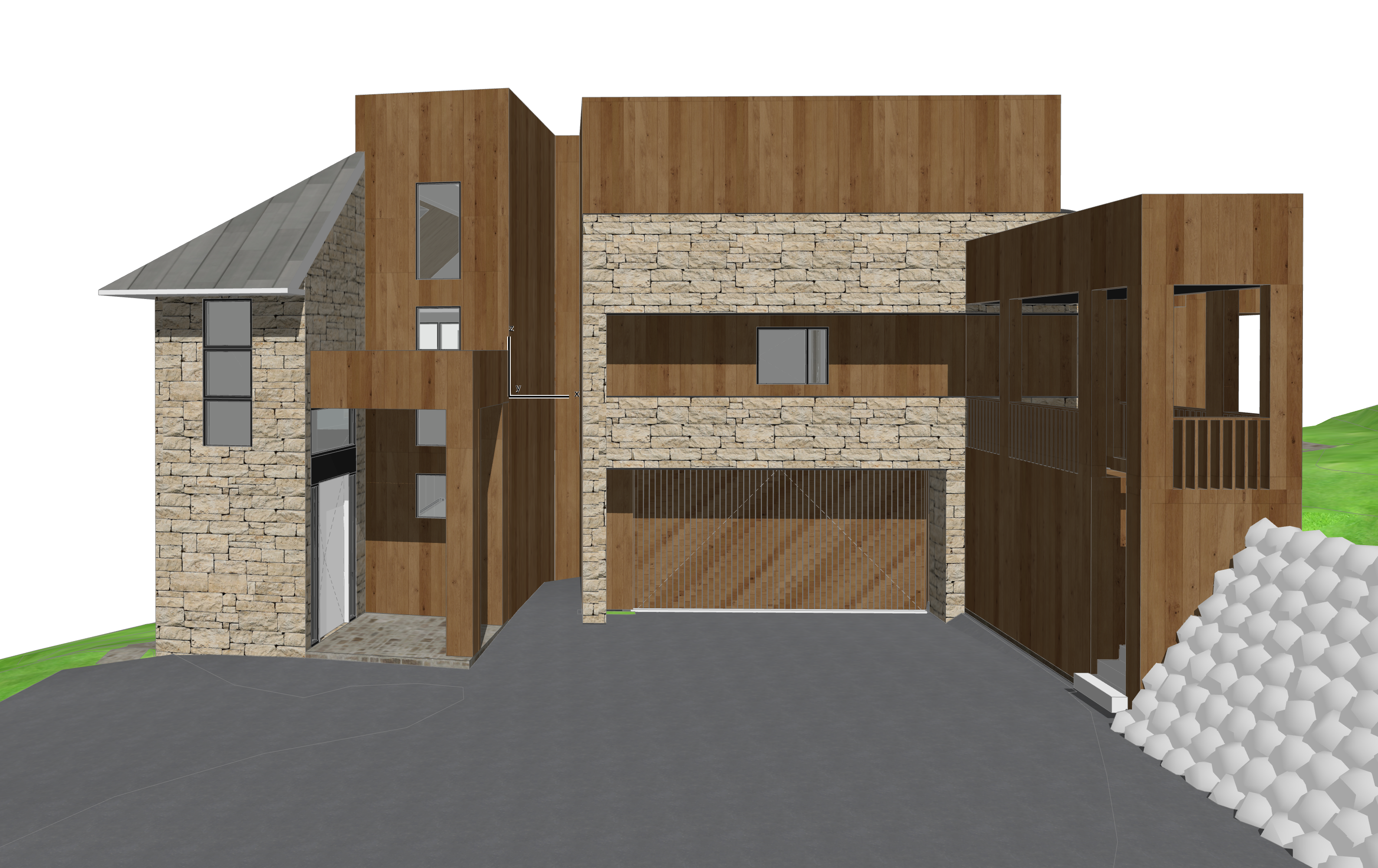 convert this floor plan into a realistic isometric 3d view of a full house show the space from an elevated angle with furniture walls and details visible maintain existing geometry and location of materials add in landscape features for snowmass co where stone is shown use colorado buff limestone veneer stone maintain the driveway as asphalt use the same furniture as shows on the plan do not change the orientation of the floorplan
