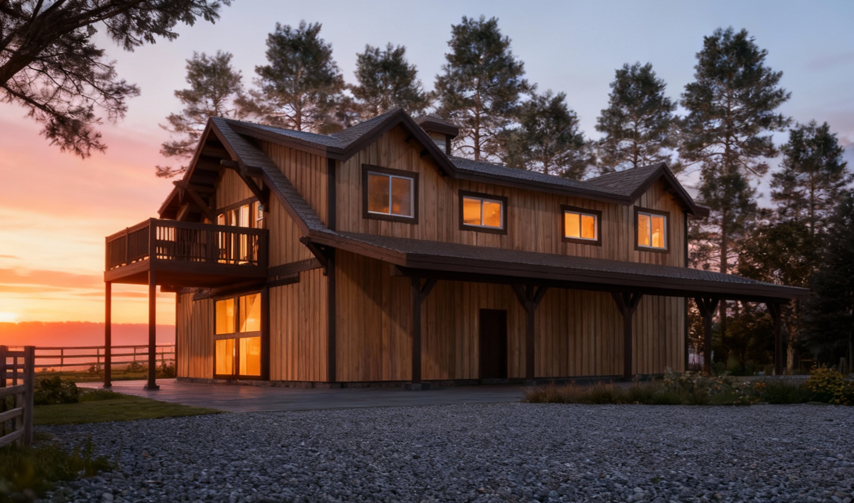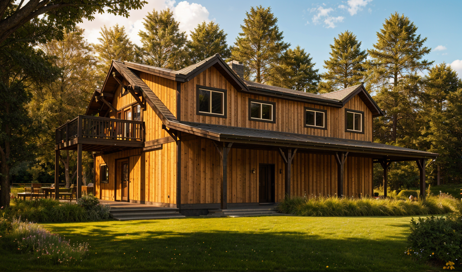 maintain the current materials of the architecture but enhance them a bronze standing seam roof on the two story house enhannce the concrete and wood siding materials enhance the quality of the car and outdoor furniture a lush dense forest of tall mixed evergreens and hardwoods place the sun behind the trees so warm golden sunlight beams through the branches casting soft rays and subtle dappled highlights across the patio siding and grass create ultra realistic lighting crisp shadows detailed textures in the wood siding and glass reflections and a vibrant clear sky with light atmospheric depth render in hyper realistic architectural visualization quality 8k resolution make the vegetation in the landscape hyper realistic and use plants native to truckee california do not change the view