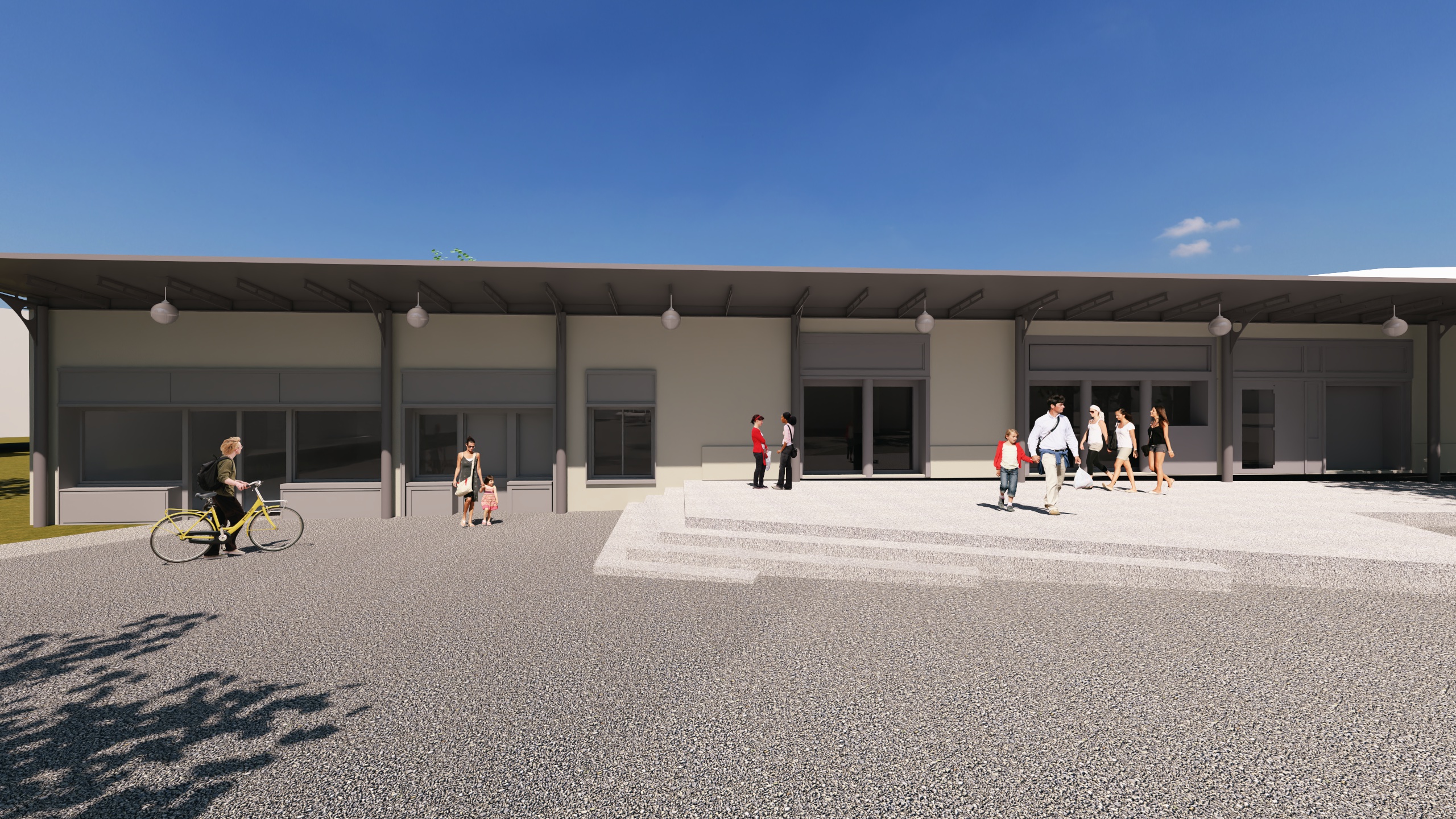 photorealistic front view of a renovated commercial fa ade in france inspired by the reference image keep the same architecture proportions and signage layout the building has a clean modern design with warm beige plaster walls elegant grey blue metal framing and large glass storefronts the shops include a patisserie chocolaterie mpp matthieu pouybareau with a warm golden light interior a boutique entrance cr ateur de go t a modern bank caisse d pargne with posters inside one neutral empty local and a cozy caf dr le de caf with wooden furniture visible inside add realistic lighting warm afternoon sunlight with soft shadows and subtle reflections on the glass slight glow from interiors to show activity inside people passing by cyclists families and pedestrians create a lively friendly urban atmosphere realistic materials high detail global illumination 8k render cinematic lighting soft sky reflections texture richness on walls and glass summer atmosphere with small green trees and planters nearby the composition should look bright inviting and elegant combining modernity and warmth dont change the architecture