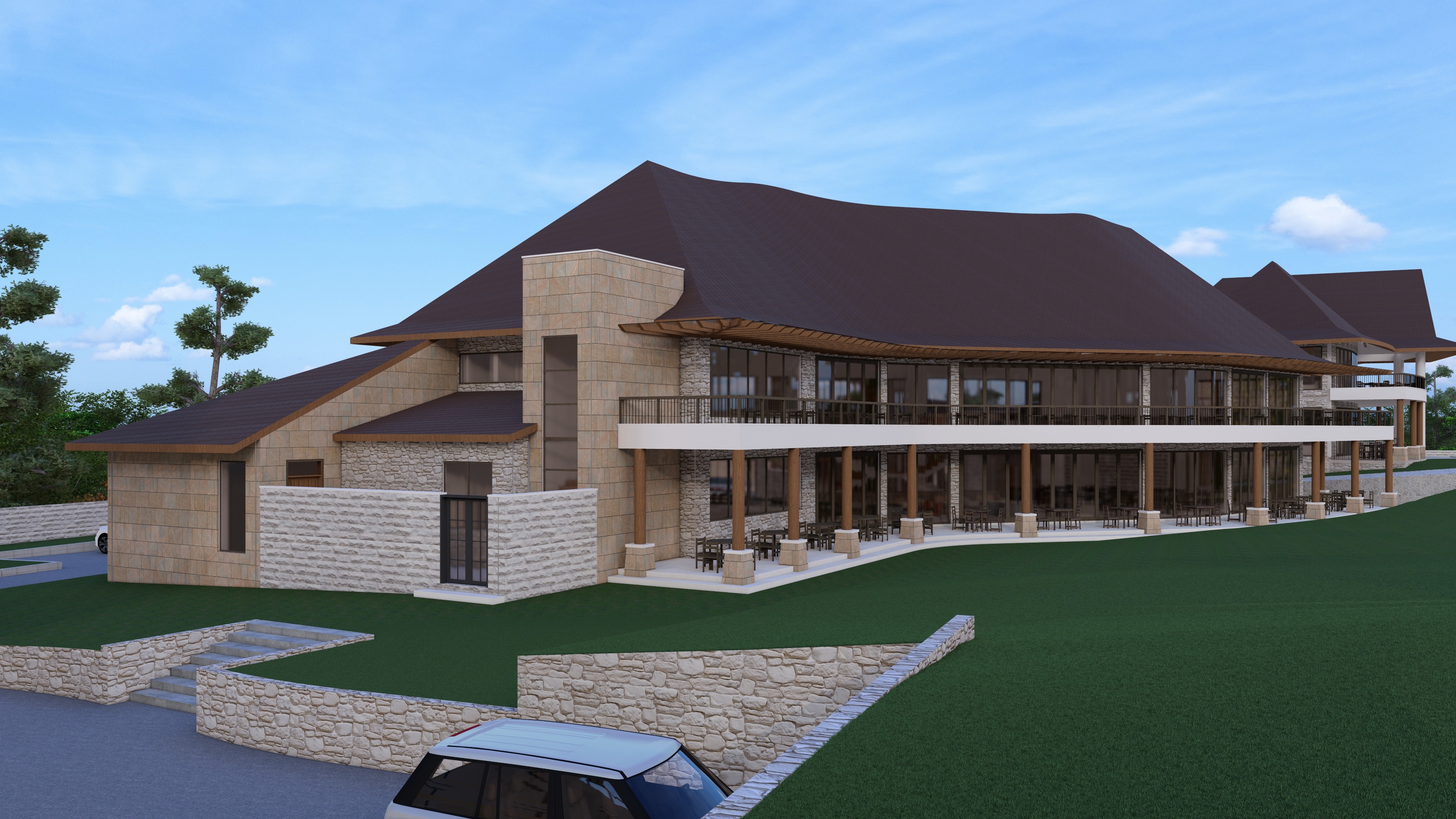 this is a resort restaurant enhance the scene by making it look a bit lived in make grass look more realistic add vry few trees to the compound retain roof texture and some potted plants few around where the furniture is but not on the columns maintain all materials as they are just enhance colour shades do not adjust or crop the main building p s we have no wooden walls