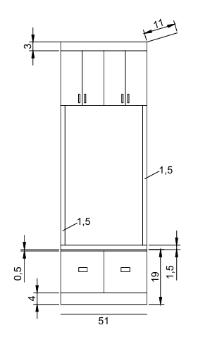 make me this realistic piece of furniture in black with gold handles respecting the measurements and fitting it into a space with two white walls on either side