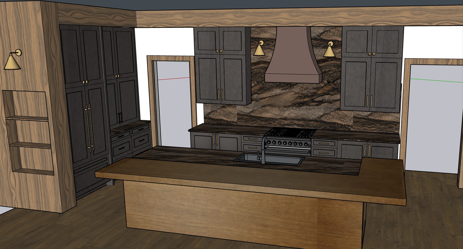 scene preservation critical use the provided sketchup model exactly as is do not redesign simplify or reinterpret geometry maintain all cabinet layouts proportions door styles trim backsplash hood shape and island structure exactly as shown strict material assignment do not override geometry vertical surfaces all cabinetry perimeter cabinets deep black stained wood with visible grain not painted not flat black island base medium caramel wood tone with natural grain and warmth tall paneling trim match island wood tone horizontal surfaces only countertops apply polished exotic granite titanium gold style only to countertop surfaces do not apply granite to island sides cabinet faces or any vertical surfaces important rule stone granite horizontal planes only wood vertical cabinetry only countertop description apply only to tops polished exotic granite with dramatic horizontal flowing veins deep charcoal black warm brown bronze and gold tones organic layered movement with high contrast medium to large scale veining subtle polished finish not overly glossy natural stone variation with fine mineral detail hood fixtures range hood brushed copper with soft natural patina keep exact shape hardware warm brass tones maintain placement doorways both side doorways must open into real interior rooms not blank space use warm cohesive tones wood taupe soft browns no bright white or exterior light slightly dimmer lighting than kitchen lighting overall brighter warm natural interior lighting sconces must cast visible downward light onto backsplash add soft under cabinet glow preserve warmth do not wash out materials preserve these exactly backsplash pattern and color flooring tone and direction cabinet layout and spacing island proportions and overhang all trim architectural details do not turn island into stone do not remove wood grain do not flatten cabinet color to pure black do not crop cabinetry do not overexpose lighting do not simplify materials photorealistic render using existing model geometry high resolution pbr materials accurate scale global illumination realistic shadows interior architectural photography style