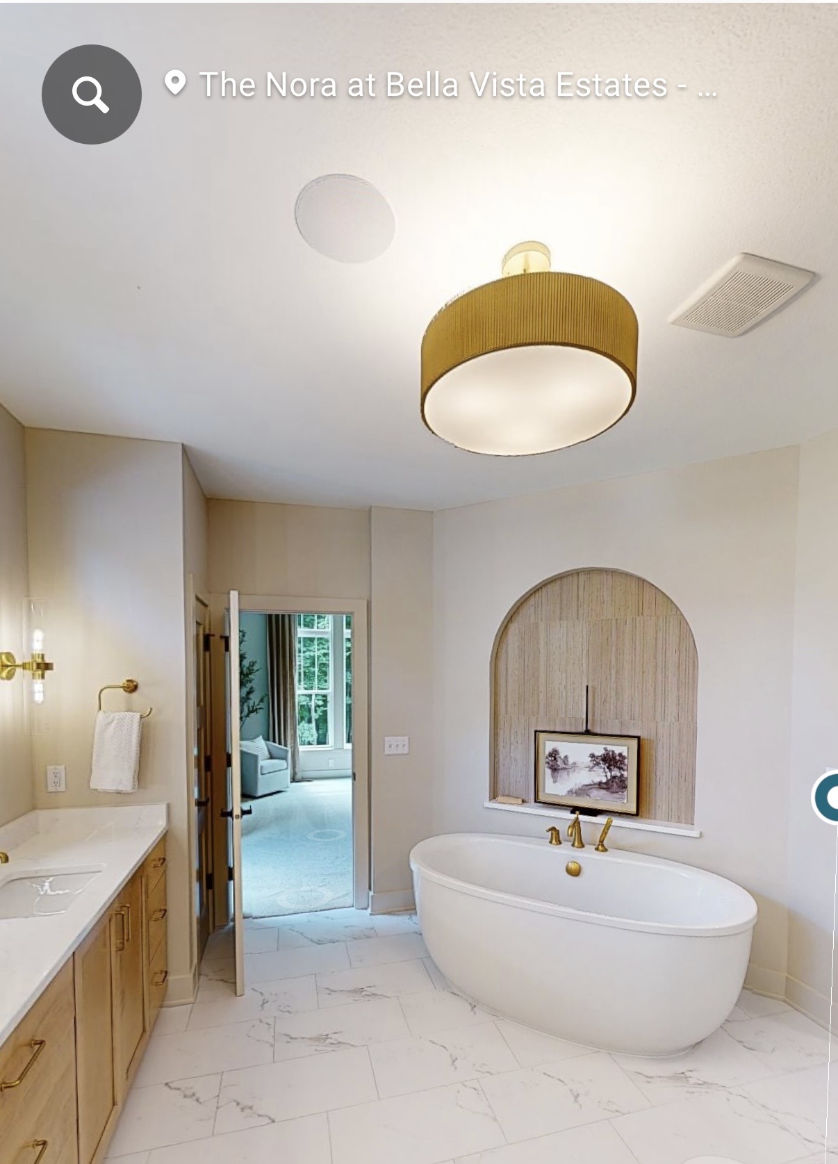 change to wide plank european white oak flooring change chandelier to something fancier change the cabinet color to iron ore paint color change only the left side small wall behind the tub to light brown wood fluted tile