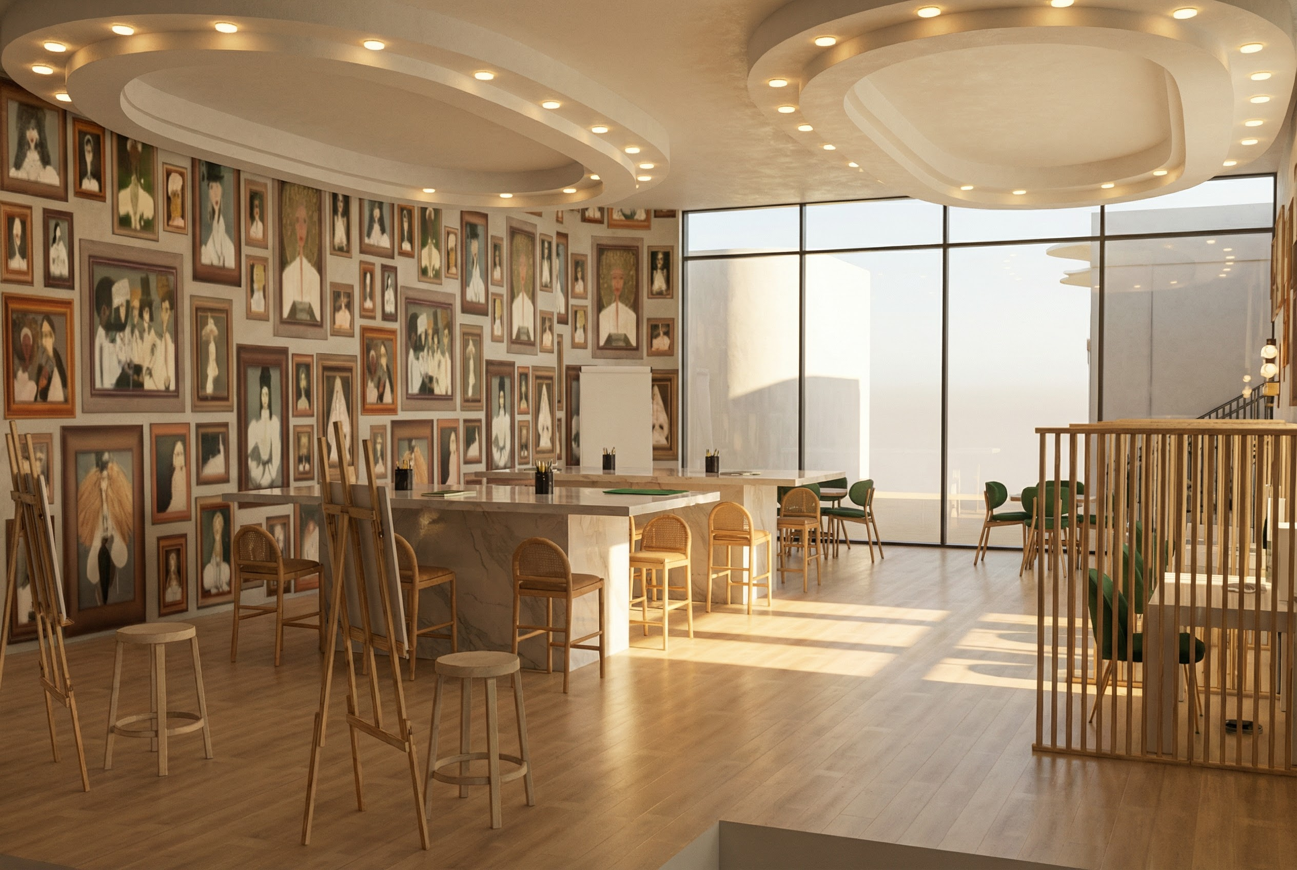 render this shaker style door kitchen with dark blue base cabinets and walnut upper cabinets cabinet above the fridge should be dark blue brass bar pull handles countertops and backsplash should be white quartz with very subtle grey and gold vein backsplash to match countertop flooring to be medium oak walls to be white window shills to be white appliances are white with brass handles the room in the background is a double height lofted living room with windows at 2 levels