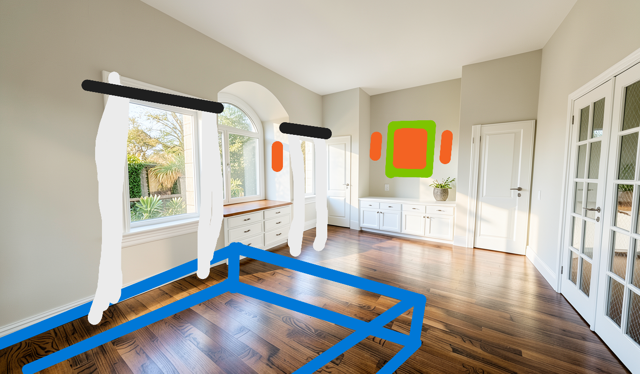 create a bedroom with a cozy white metal bed soft white sheer curtains and black curtain rods over the casement windows 3 wall sconces in gold color create a cozy environment a gold picture frame with a an image of tress is centered above the dresser cabinet