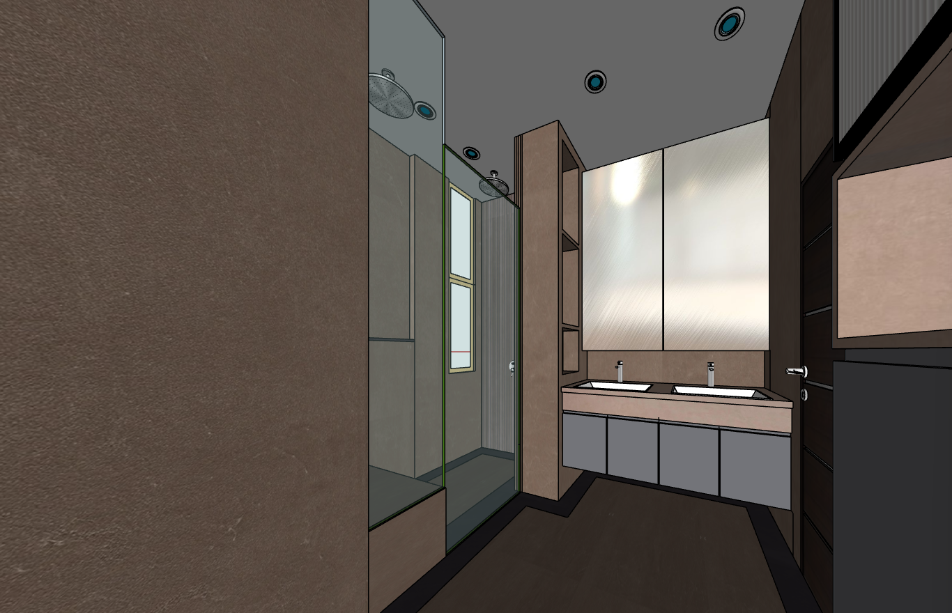 mukka 12cp rm floor with res art lava ret 150mm border for shower area and dry area remove wardrobe handle with only finger pull gap full height cabinet top cabinet is fluted glass door with black metal frame