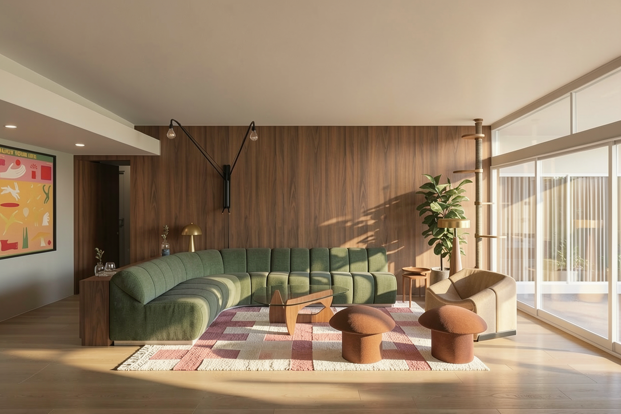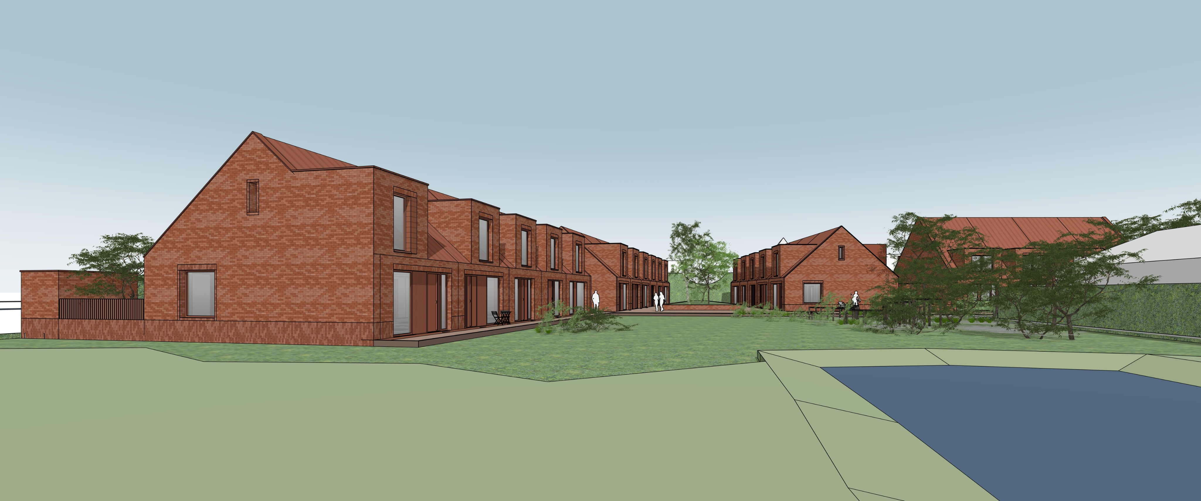 atmospheric architectural visualization of a calm and inviting residential courtyard composed of contemporary brick buildings with pitched roofs and simple refined geometries roofs clad in red brown vertical panels with a soft matte slightly weathered appearance fa ades in warm uniform red brown brick wooden window and door frames subtly richer and redder in tone adding warmth and contrast brick dormers gently integrated into the roofscape the setting flows into a lush ecological meadow landscape with tall grasses wildflowers low plants and scattered shrubs forming a natural slightly wild environment the landscape feels soft immersive and expressive like a nature playground where children can wander and play freely a small courtyard tree with warm toned foliage adds a poetic seasonal accent the overall atmosphere is harmonious and intimate expressing a small scale cohesive neighborhood with a strong sense of community and human scale lighting is soft diffused and slightly glowing with a dreamy overcast sky and subtle warm highlights breaking through clouds gentle haze soft shadows and a slightly painterly quality colors are natural but delicately enhanced with a warm red brown palette a few people appear as soft understated figures neighbors interacting children playing in the grass blended naturally into the scene style semi realistic atmospheric slightly painterly architectural render cinematic mood soft focus depth subtle grain poetic composition emphasis on light air and feeling rather than sharp detail parameters maintain color harmony warm red brown tones seed 10