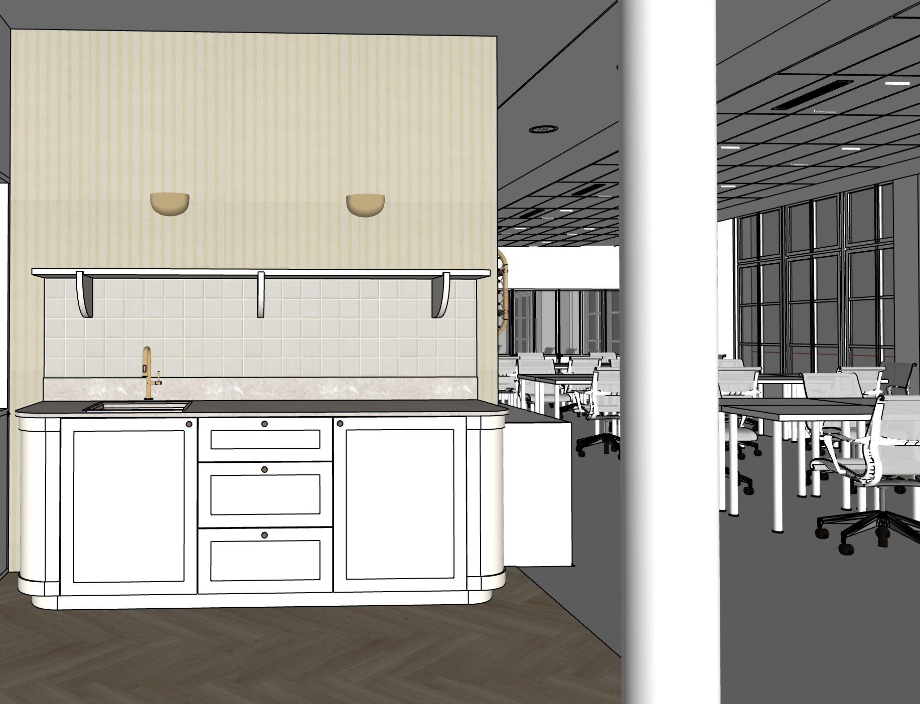 beige kitchen light warm open space office white full furniture desk warm sun lighting wall in white wallpaper wall kichen raphia beige