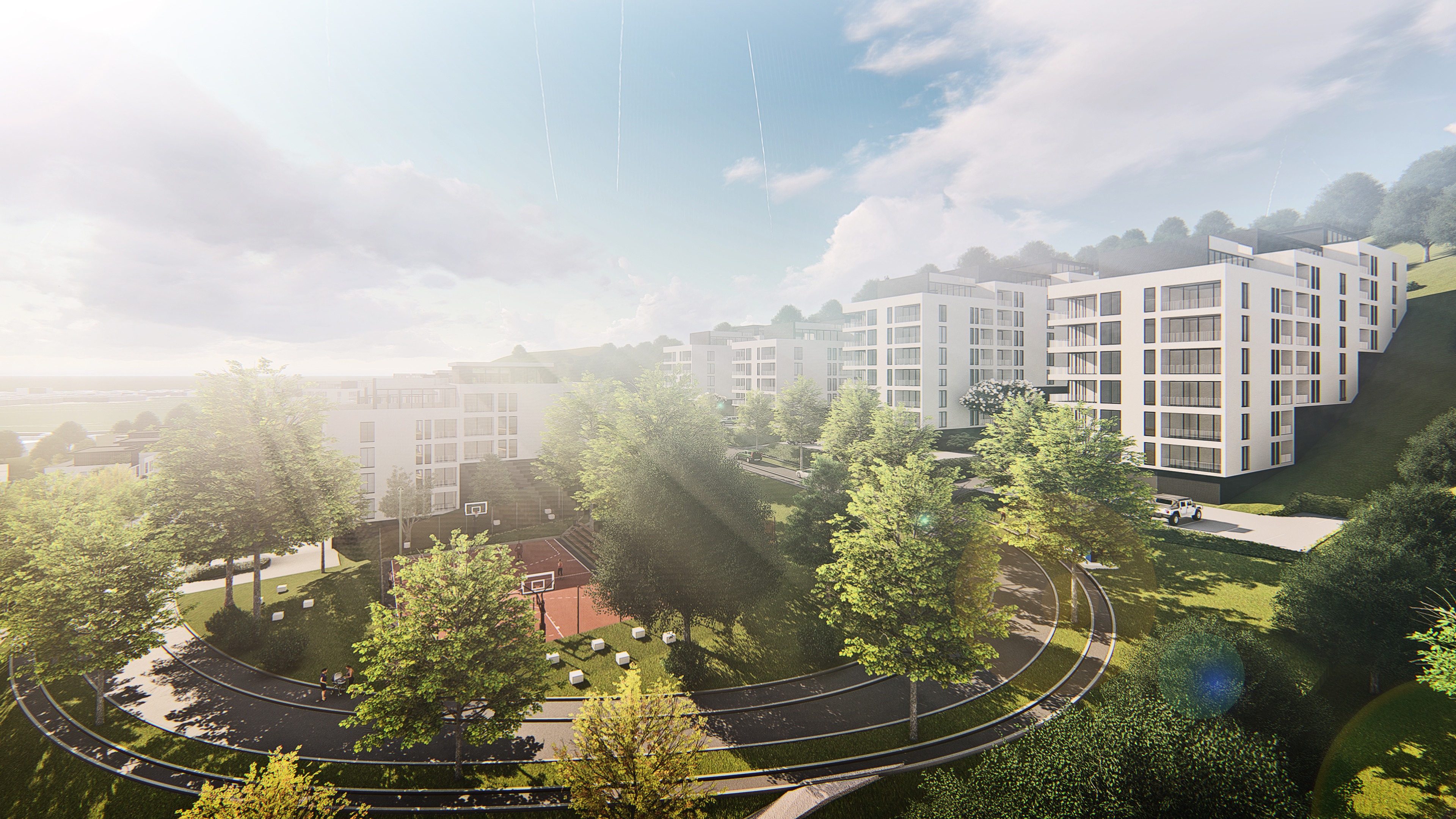 important preserve the existing geometry and the existing context exactly as provided do not modify alter reinterpret add remove scale or reshape any geometry do not change the site surroundings street layout neighboring buildings vegetation or context elements do not modify geometry scale proportions buildings road layout sidewalks or surrounding context in any way do not change text photorealistic architectural rendering clean and balanced contrast calm cinematic mood style contemporary european residential architecture minimalist premium understated include people subtle motion blur for realism keep the green roof do not add people remove the lens flare