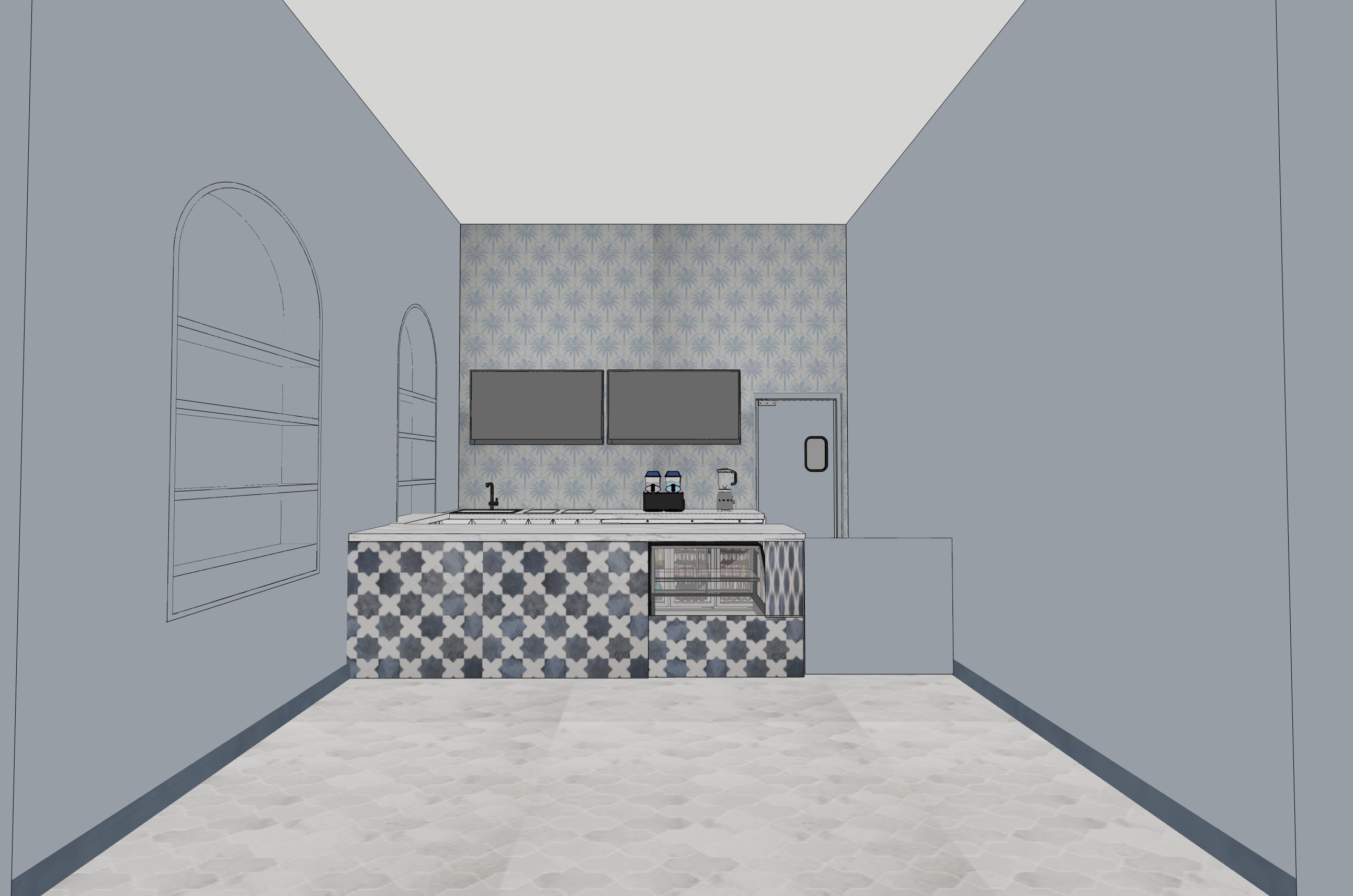 create a highly realistic photorealistic rendering of the existing caf design maintain the exact layout architecture and built ins as shown style the space as a modern aesthetic instagram style caf with a soft cohesive neutral color palette accented by subtle pink tones add refined decorative touches in blush pink warm beige cream and light wood such as ceramics coffee accessories wall art floral accents and soft textiles keeping everything elevated and minimal not cluttered install elegant chandeliers centered above the bar area warm brass or champagne gold finish providing soft ambient lighting lighting should be warm and inviting with a natural daylight balance enhancing textures and finishes emphasize a cozy yet upscale atmosphere editorial styling clean surfaces and thoughtful vignettes suitable for social media photography camera angle at eye level wide angle interior shot professional hospitality photography style ultra realistic materials high detail sharp focus soft shadows