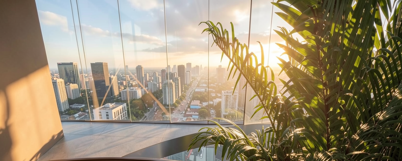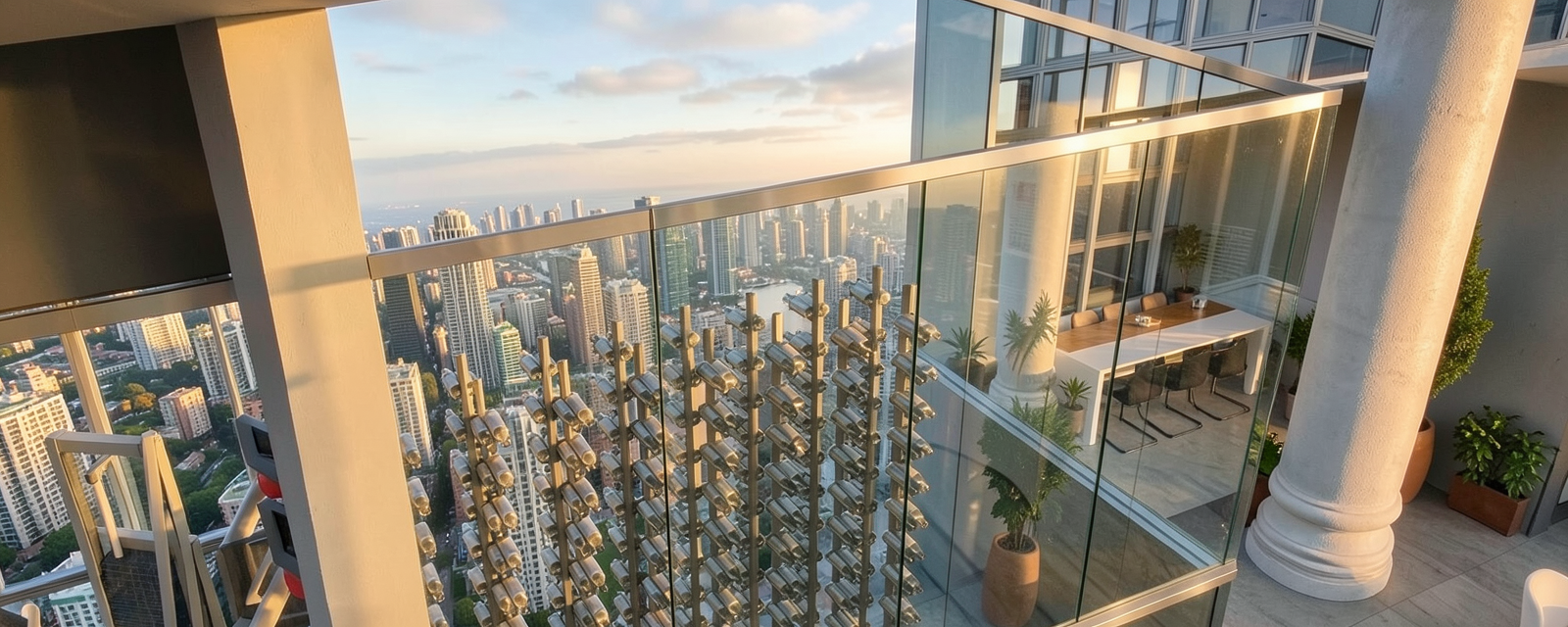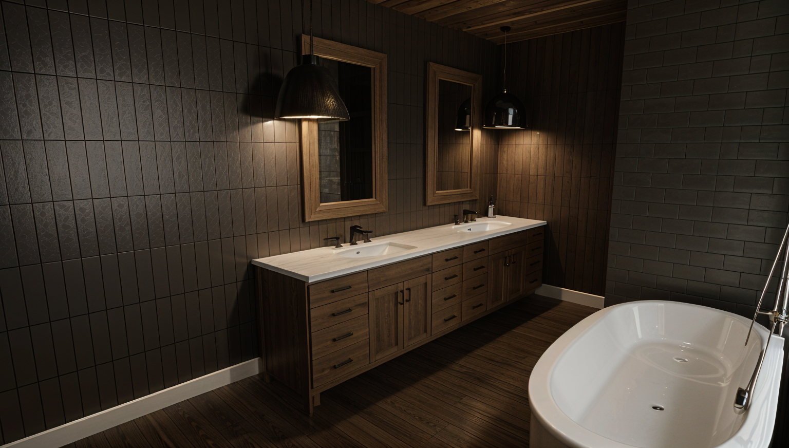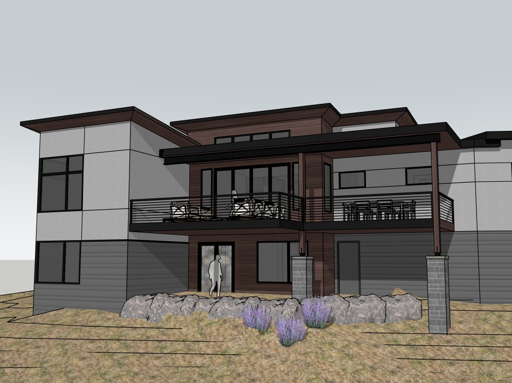 match stucco and wood material from last rendering metal siding is medium tone grey at 12 spacing exterior railing is a 3 wide steel handrail with cable railing at 4 o c wood post bases are to match stone on previous renderings the setting is late afternoon with minimal sunlight and ponderosa pines in the background