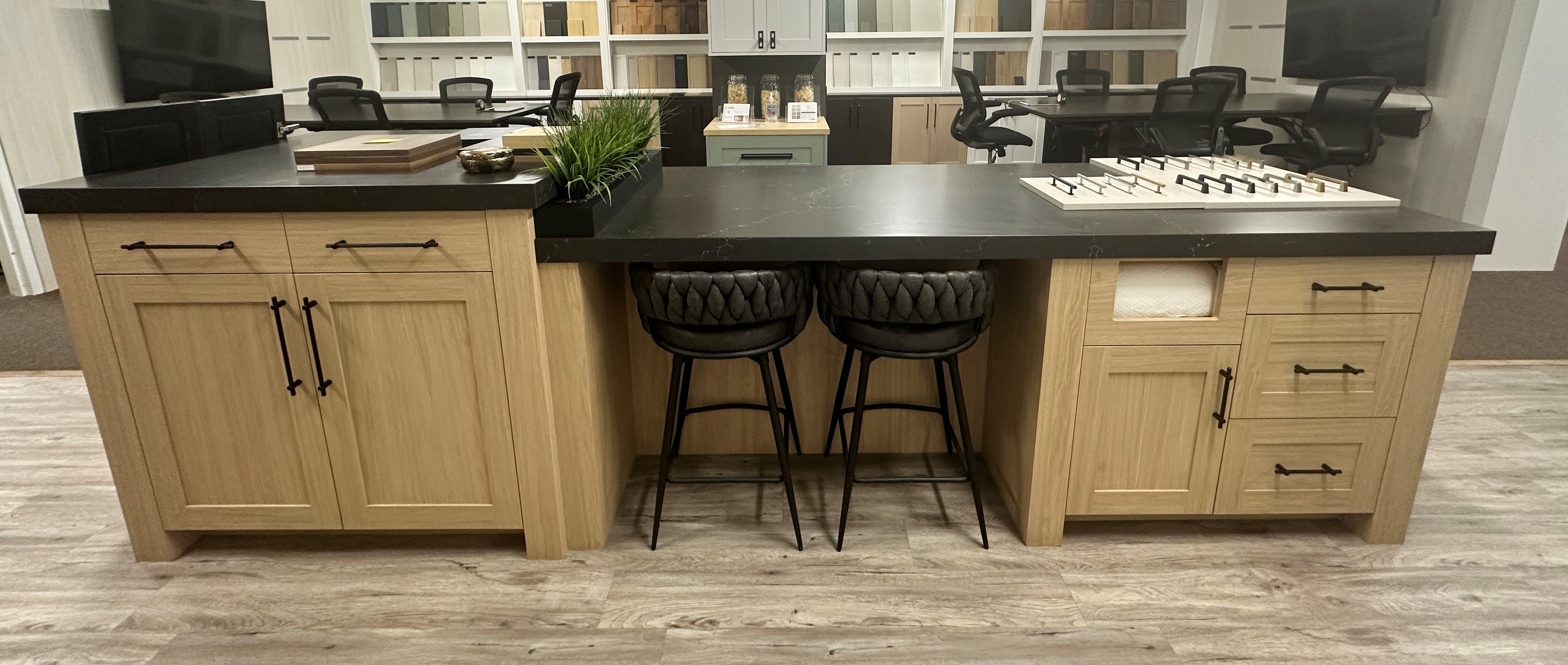 put this island into a residential house with natural light restage the items on the countertop but keep the countertop itself new light grey flooring blur the background so it focuses on the island do not change the cabinets at all