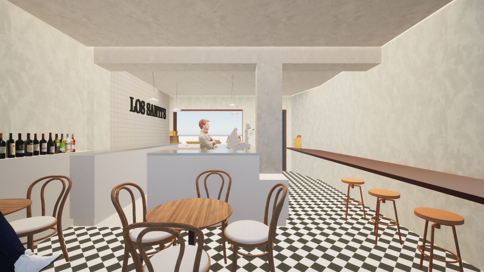 create a ultra photorealistic image if this make the squares in the floor bigger and have the name santi s in the left wall