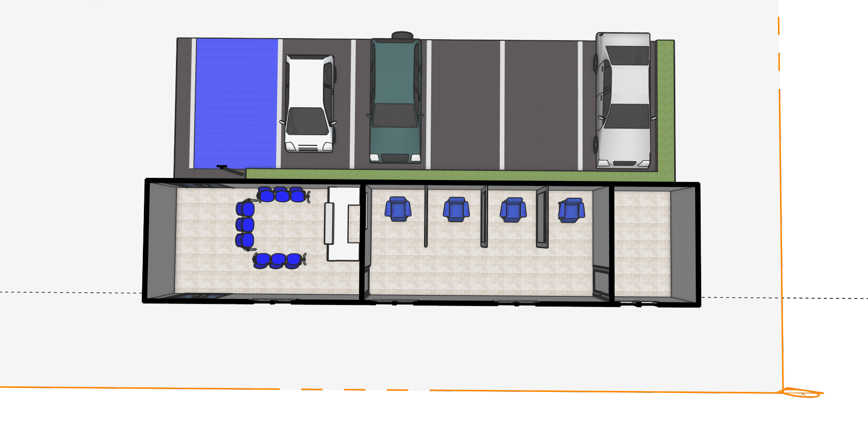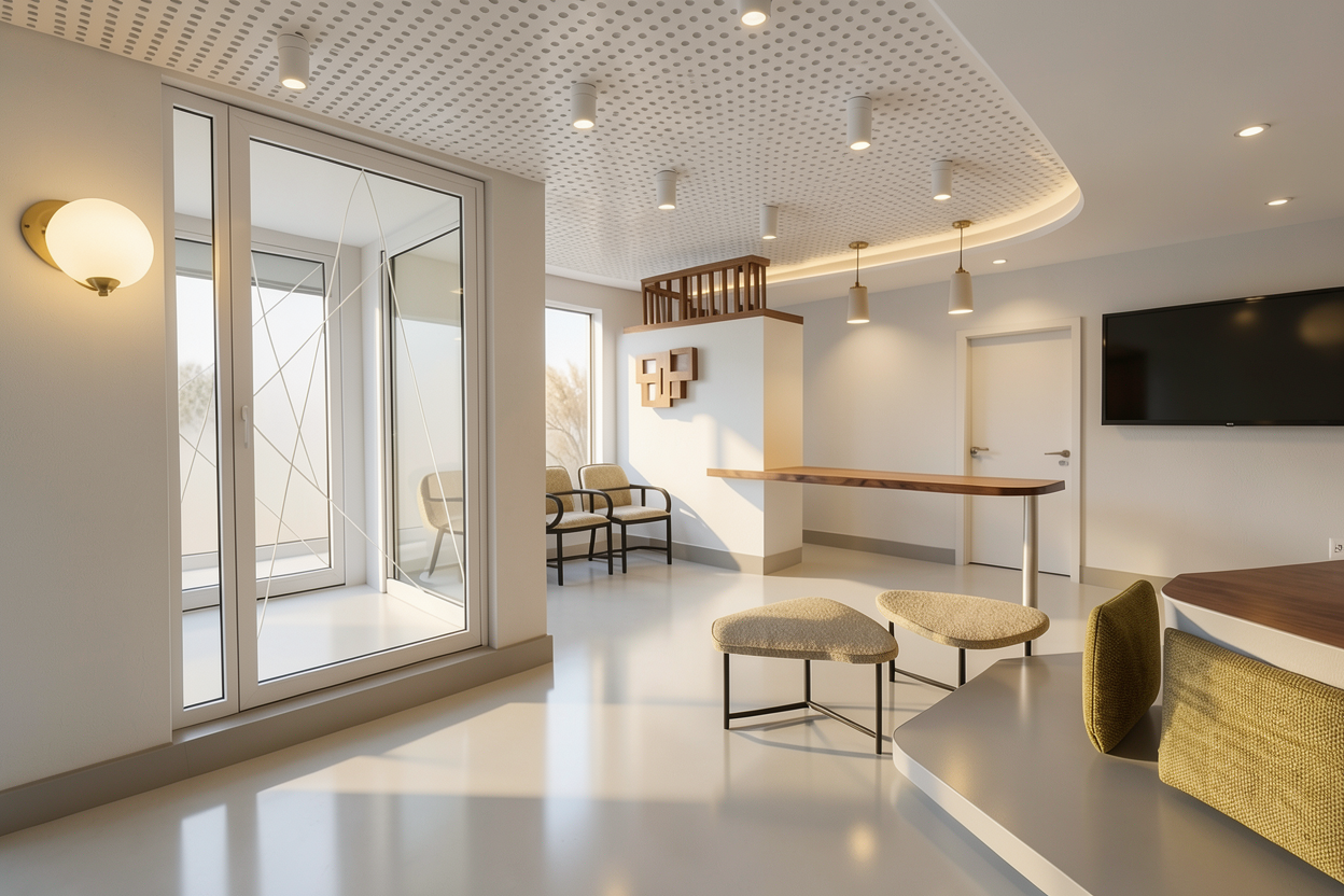 a modern waiting room with a minimalist design featuring sleek cobalt blue chairs with black accents on the arms and legs the walls are painted a soft calming white the floor is tiled with a light beige pattern offering a clean and welcoming appearance a simple light gray reception desk is positioned against one wall under soft white ceiling lights that create a peaceful and inviting ambiance the door is a neutral gray with a frosted window adding a touch of privacy the atmosphere is serene and professional perfect for a modern office or clinic