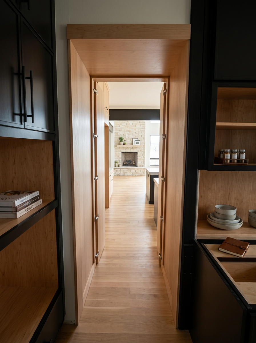 do not change the cabinets in any way preserve the exact cabinet colors materials finishes dimensions door and drawer styles hardware spacing alignment and all geometry exactly as shown do not alter the countertop shape backsplash appliances flooring lighting fixtures or wall structure only remove the construction materials clutter and mess from the scene clean the room and make it look finished and staged add a few simple tasteful home accessories appropriate for the style of the space but do not add or remove any furniture windows or architectural elements maintain the original lighting direction and realism enhance clarity and polish the photo while keeping the cabinetry and room design completely unchanged do not alter the lighting to keep the cabinet colors as they are in the image add a subzero built in fridge in the opening on the right with stainless fronts do not change anything else about the cabinets remove the cardboard on the bottom of the image