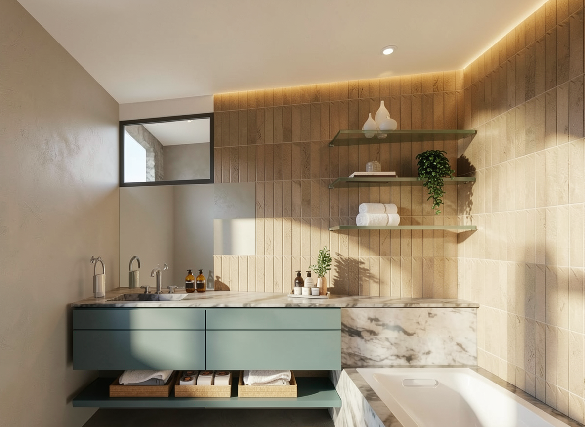 convert this simple colored 3d model into an ultra photorealistic render of a high end minimal luxury bathroom critical constraints must follow exactly preserve 100 of the original geometry proportions layout and scale from the uploaded 3d model do not modify reinterpret or redesign any shapes or dimensions only enhance materials lighting and realism materials and surfaces ceiling natural sauna wood planks warm tone fine grain subtle variation perfectly aligned matte oiled finish realistic depth between planks floors walls shelves and all other surfaces seamless mortex finish light beige color ultra matte soft cloudy texture continuous without joints subtle handcrafted imperfections shelves also in mortex same light beige fully seamless no visible joints or transitions strict rule no led strips no integrated lighting and no light lines in or under the shelves fixtures shower and faucet brushed stainless steel rvs realistic brushed texture soft reflections no chrome look toilet villeroy boch viclean wall mounted minimal and accurate proportions window treatment add horizontal blinds in the window highly realistic thin slats correct spacing and alignment natural light interaction soft shadows subtle light filtering between slats slight variation and imperfection for realism not perfectly uniform styling add a few neatly folded towels on the shelves neutral tones beige cream natural placement slightly imperfect for realism lighting very important highly realistic architectural lighting only soft indirect ambient lighting combined with subtle accent lighting warm white color temperature 2700 3000k soft diffused daylight entering through the window and interacting with the blinds realistic global illumination soft shadows natural light falloff no overexposed areas no artificial glow effects rendering quality ultra photorealistic high end architectural visualization physically accurate materials pbr workflow subtle imperfections no perfect surfaces slightly softened edges no sharp cg look camera eye level view natural lens slight wide angle no distortion calm minimal composition negative constraints do not change proportions or geometry no led lines or hidden lighting in shelves no plastic materials no overly glossy mortex no unrealistic reflections no harsh or fake lighting no redesign or reinterpretation