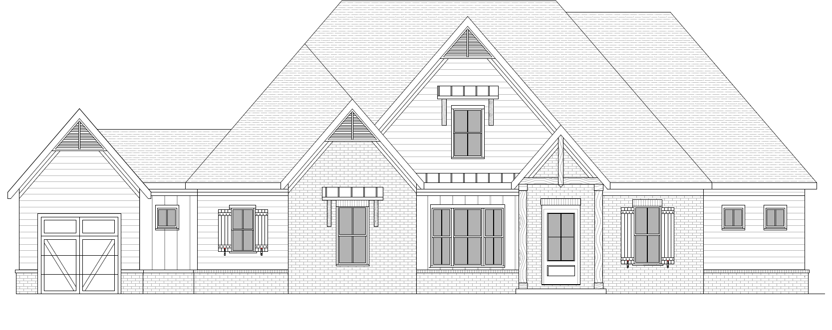 farmhouse or transitional style with white and dark metal roof at overhang wood columns and brackets dark gray garage door shutters and front door