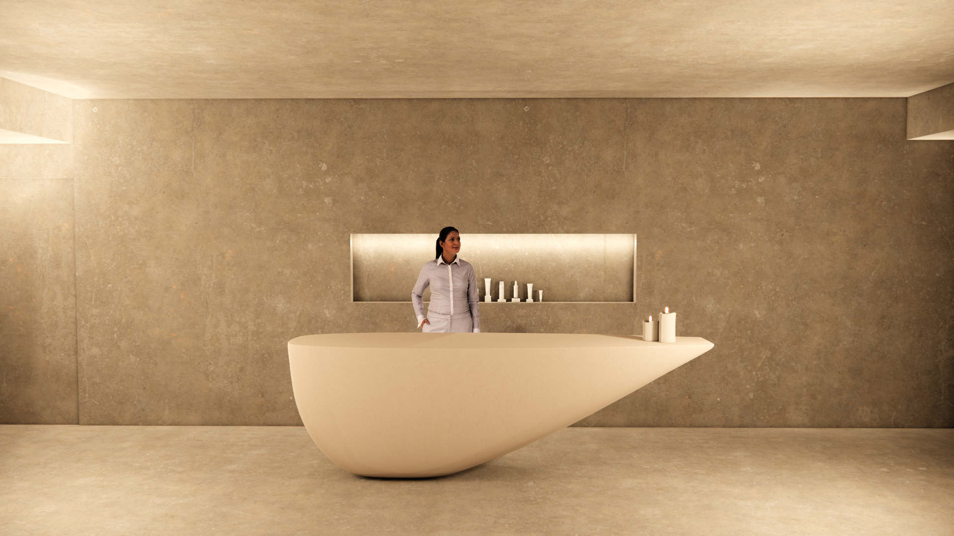 a serene and minimalist interior space with warm earthy tones the focal point is a sleek modern reception desk in a soft beige color behind the desk a person in a light gray shirt adds a welcoming presence the walls and floor are a textured sand brown complemented by subtle lighting that creates a calm and inviting atmosphere on the desk a few elegant white candles add a touch of simplicity and warmth the overall ambiance is tranquil sophisticated and harmonious
