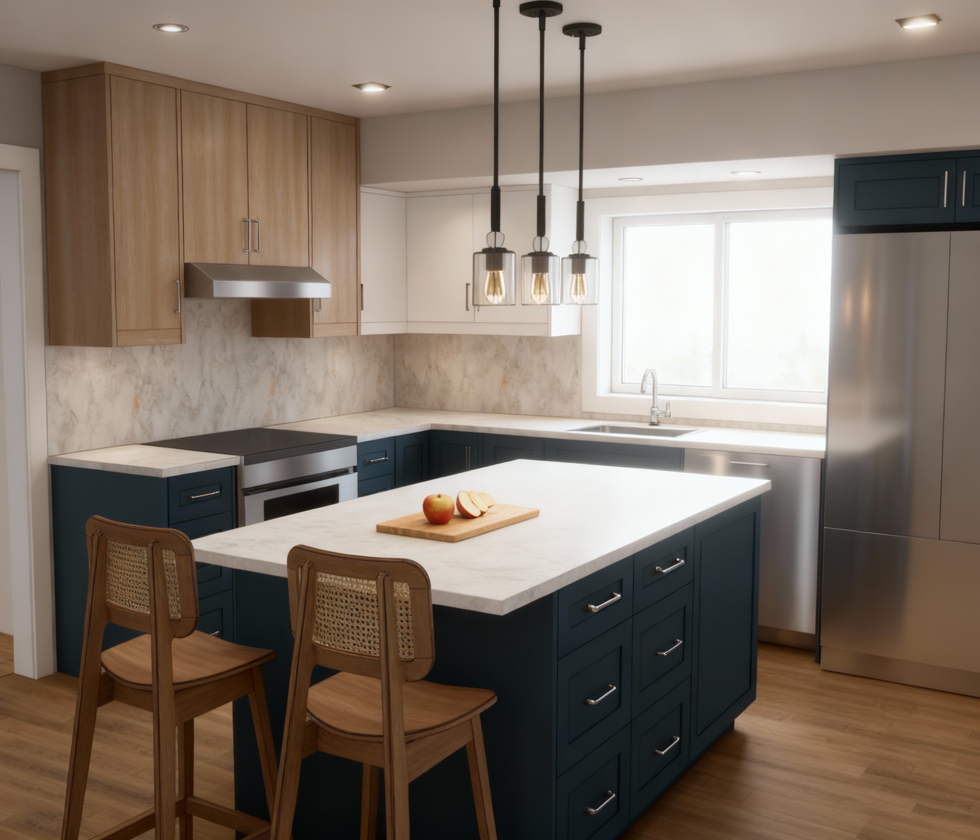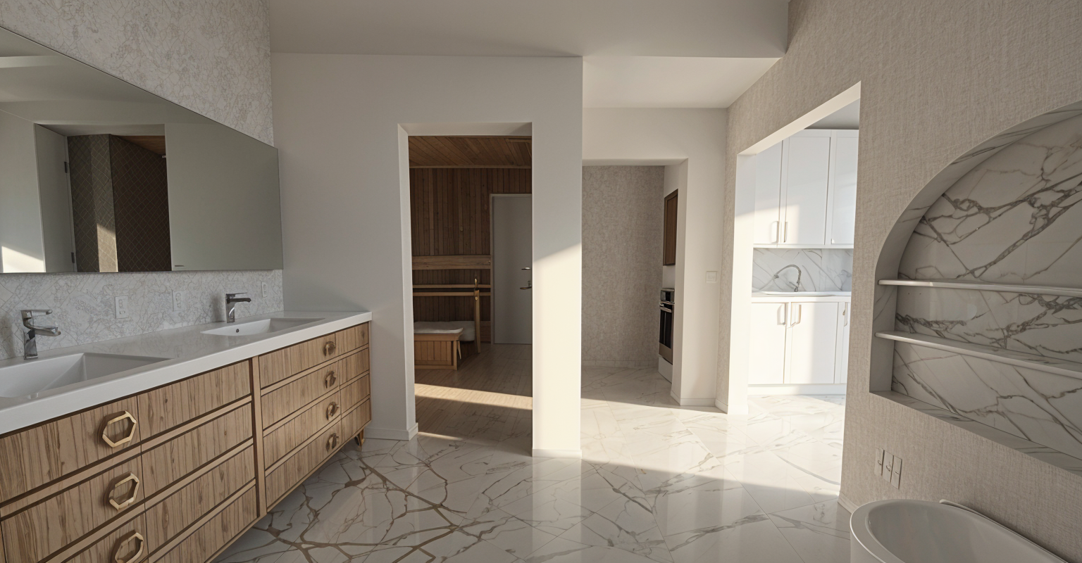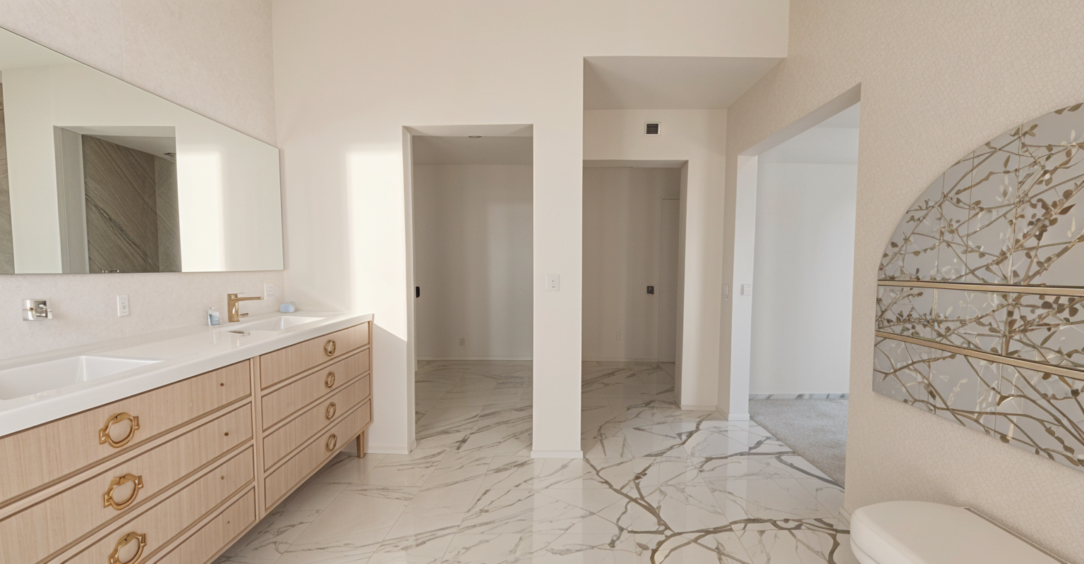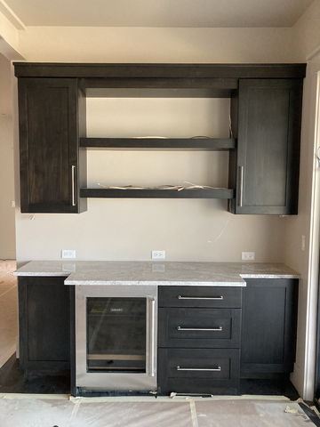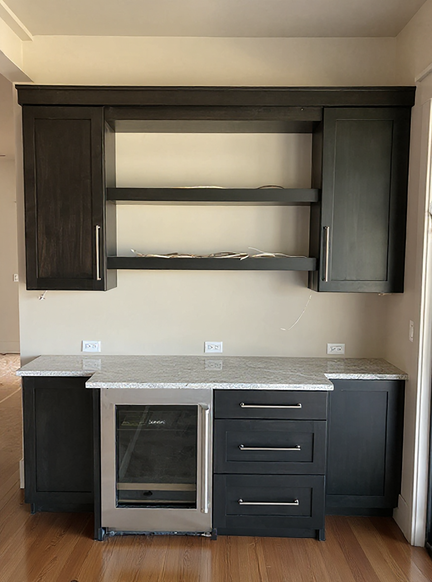 add hardwood flooring straighten the image remove the cords on the floating shelves stage the countertop and floating shelves for a simple modern mini bar add a backsplash up the entire wall to match the countertop