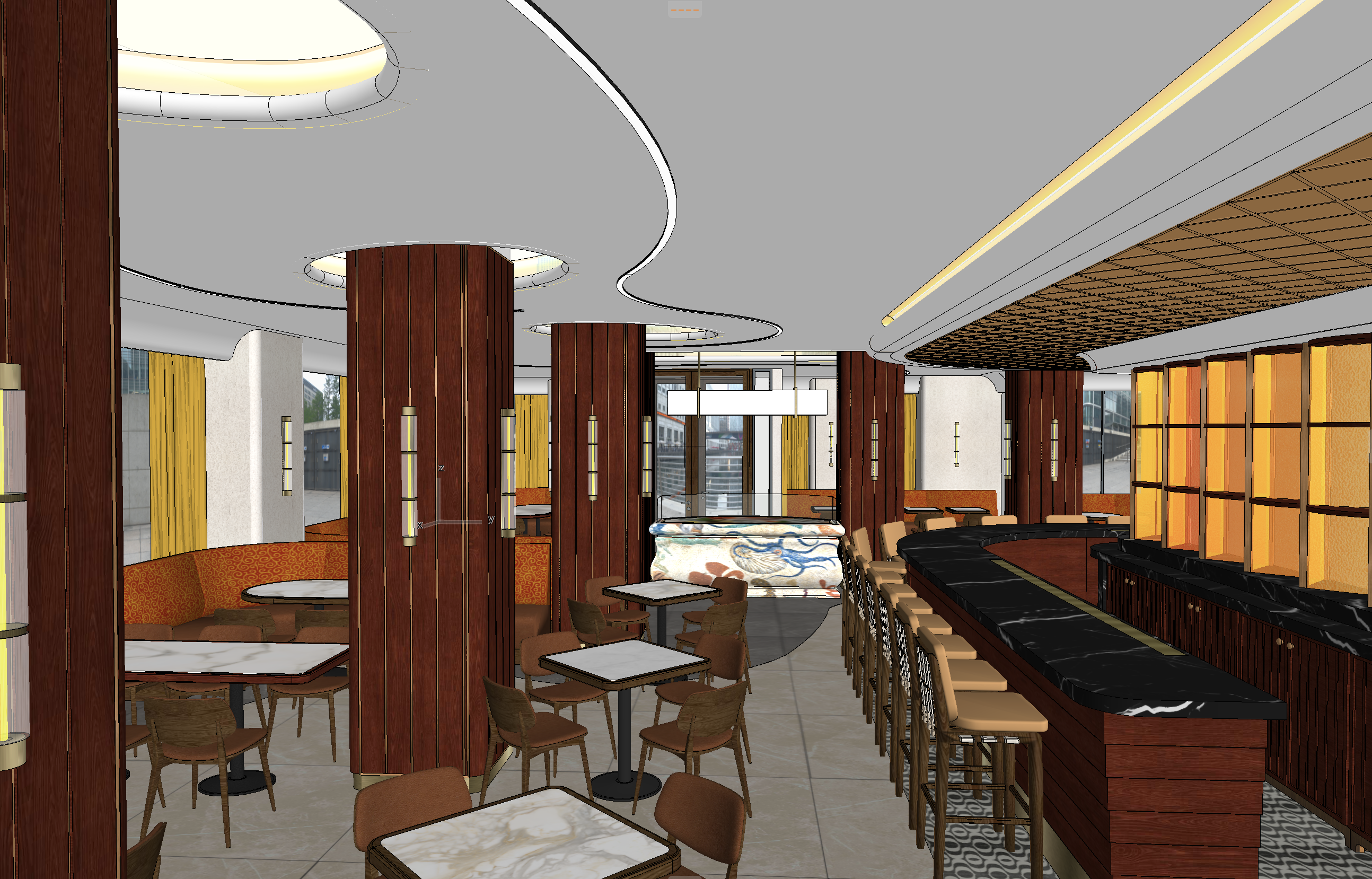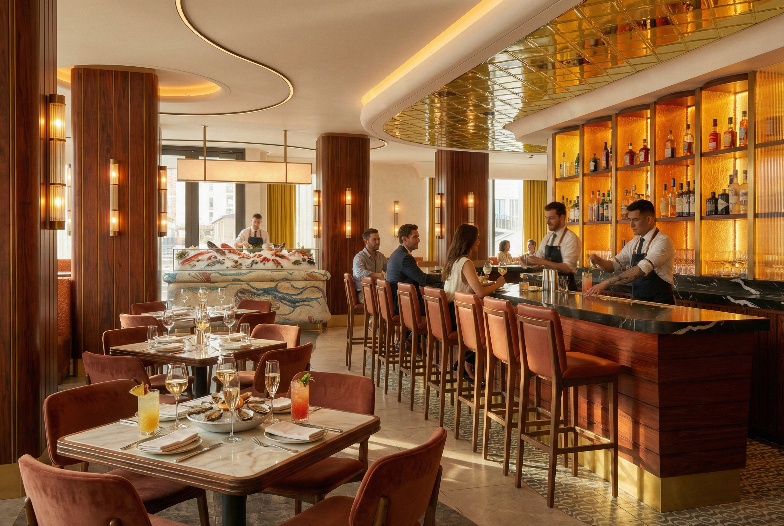 ultra realistic restaurant interior video same camera angle with slow smooth camera movement bright daytime light warm 2700k ceiling cove lighting mirrored yellow ceiling tiles blue translucent glass panel with circular cutouts rosewood columns with brass inlays orange patterned velvet banquettes marble tables caramel leather chairs yellow curtains with cove lighting add lively atmosphere tables fully set with plates cutlery glasses a few guests sitting at the bar talking bartenders and waiters serving drinks pouring wine and water subtle movement in curtains and reflections photorealistic details natural motion elegant ambience