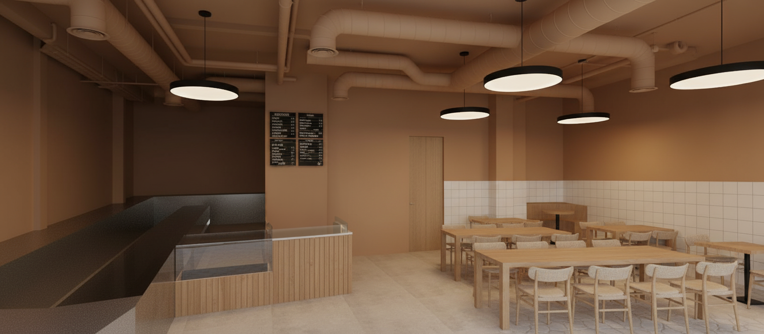 change the floor to concrete change the lamps with hanging spots add tile next to the wooden door