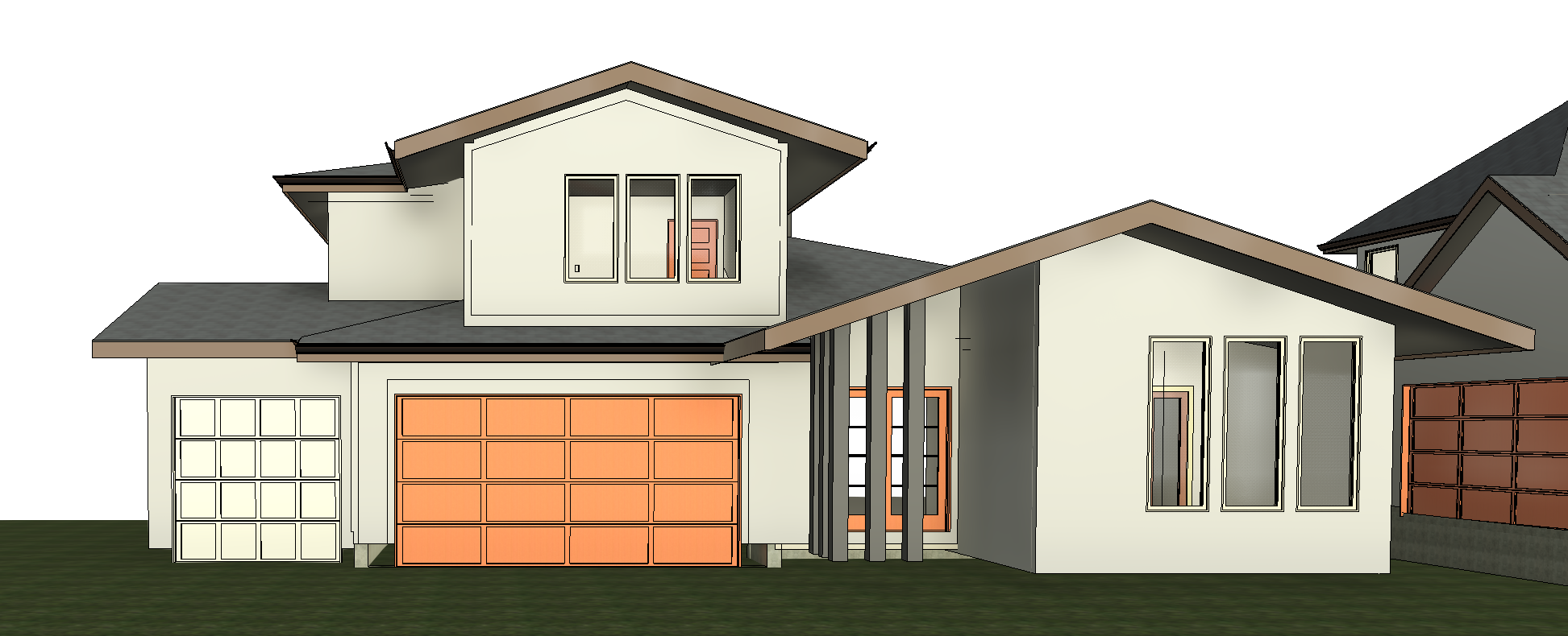 render this to look photorealistic with a nature background add light landscaping make the walls a dark grey the trim a medium grey make the whole elevation a mid century asethetic the garage doors and the front door make them a medium wood stain the columns should be wood stained as well matching the garage doors add light landscaping a driveway and stoop and walkway to the front door and let me see a little of the steet as well midday day lighting