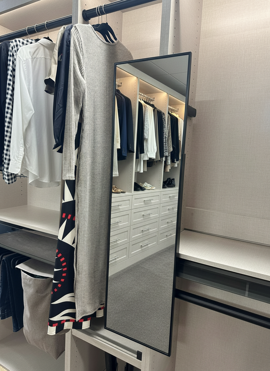 add natural light remove the coffee mug put new clothes on all of the black hanging rods add clothes hanging on the rod on the bottom right change the reflection to a bedroom