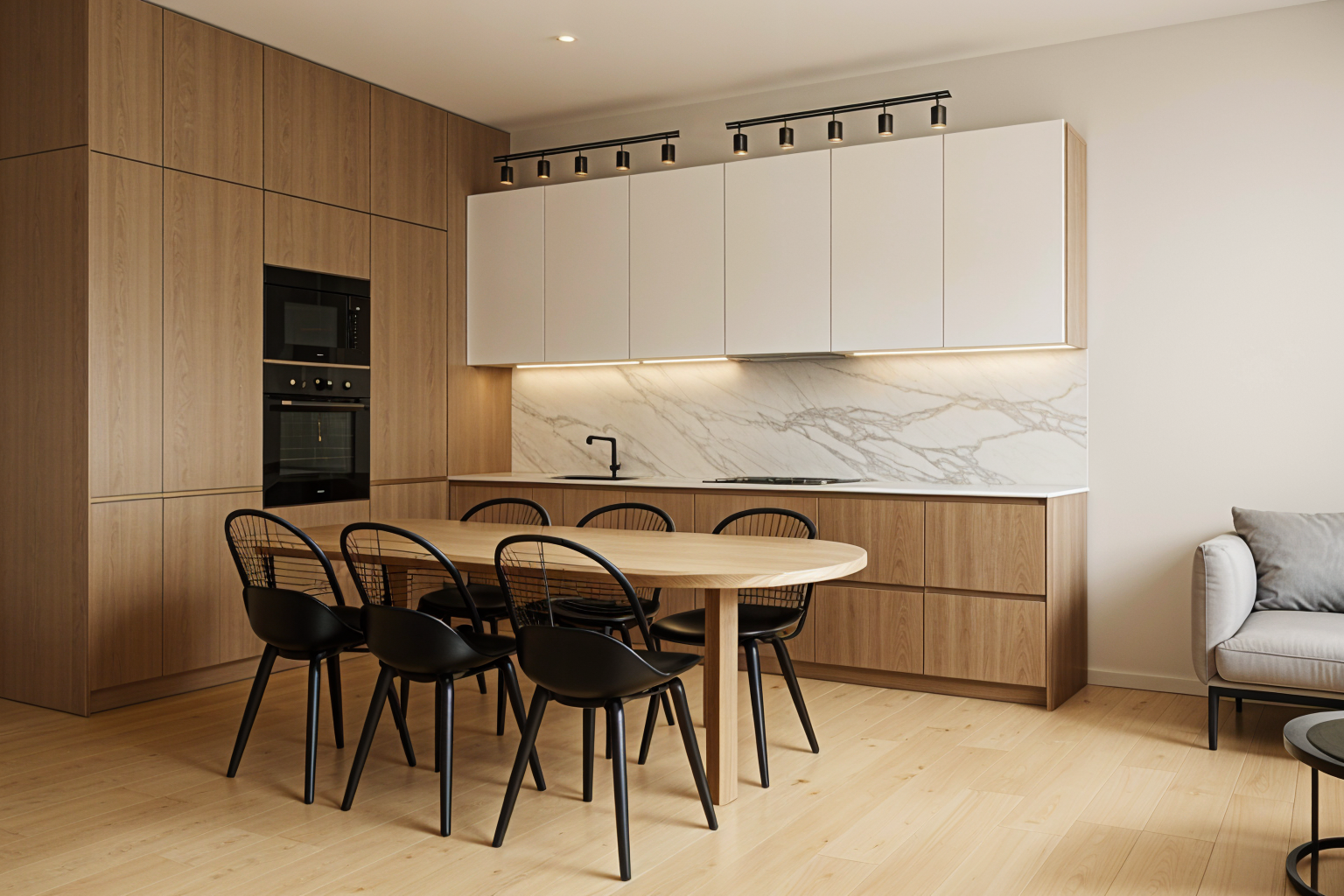 luxiury furniture scandinavian vibe with a touch of japandi please respect the gabarit of space that you ve been given add lightning and add accessories i want wow effect please put modern pendant above dinning table let colours be modest and natural as are on screen shot that you ve been given please respect the volume of space that you ve been given let it be in gabarite please let it be more like photography